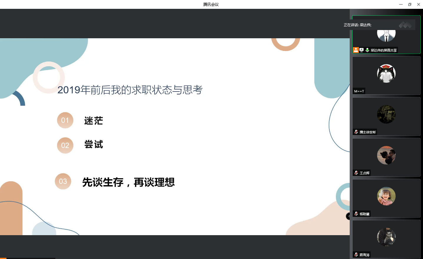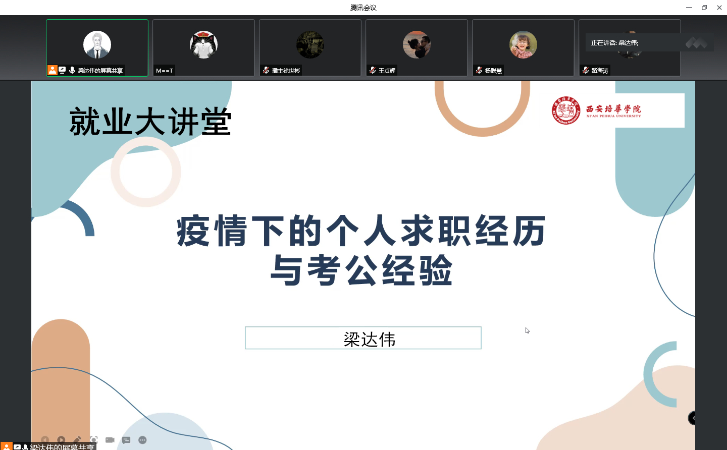 为进一步提升传媒学院学生在疫情防控常态化的环境下求职择业的选择能力,2022年9月21日14时,传媒学院邀请到西安培华学院传媒学院校友梁达伟,,通过线上会议的形式,进行了一场主题为“就业还是考编?当前环境下大学生求职择业的选择”的主题讲座,讲座由西安培华学院传媒学院学生干事乔安老师主持,传媒学院2019级、2020级学生代表百余人参加了本次活动。