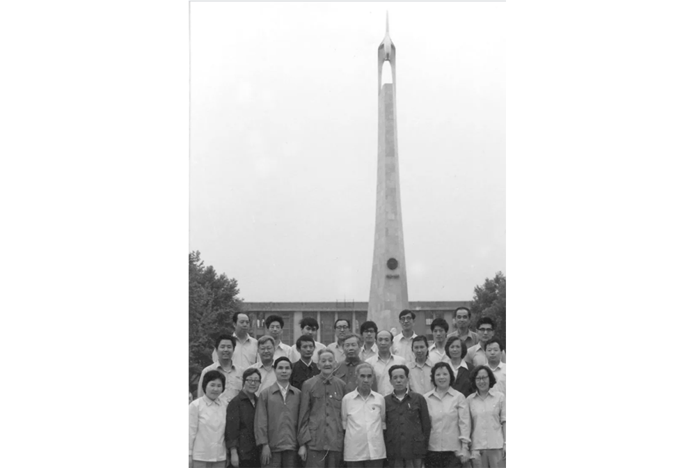 1990年物理教研室全体同志在校园腾飞塔前合影,殷大钧(前左4)