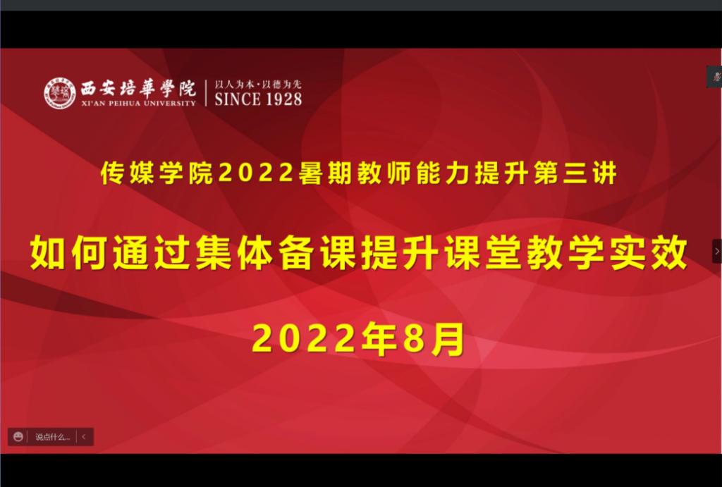 为提高教师教学能力,规范教学运行管理,积极发挥基层教研组织作用,提升下学期课堂教学实效,传媒学院在8月10日下午14:00—16:00进行2022暑期教师能力提升第三讲——如何通过集体备课提升课堂教学实效。