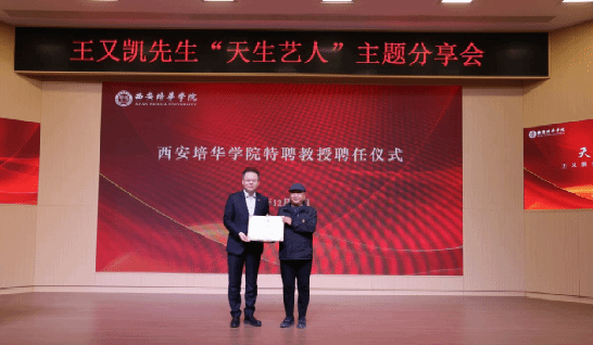 2025年12月17日下午,西安培华学院在明德楼四楼报告厅举行“天生艺人 王又凯捏瓷之路”主题分享会及王文凯特聘教授聘任仪式。理事长姜波致欢迎词,开国上将刘震将军之孙刘迪,培华早期教师、原陕西省委常委副省长刘邦显之孙刘舒辉,传媒与设计学院院长詹秦川、常务副院长徐莹、党委书记王飞及师生代表300余人出席。活动由传媒与设计学院教师贾登银主持。