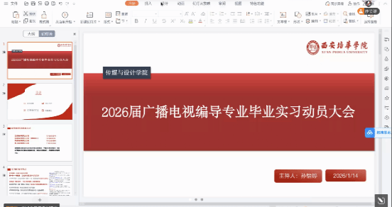 为切实做好2026届广播电视编导专业毕业实习工作,明确实习要求与任务,保障实习工作有序开展,1月14日,西安培华学院传媒与设计学院召开 2026 届广播电视编导专业毕业实习线上动员大会。会议由孙怡婷老师主持,王东莲、罗选烨、雷一鸣老师及全体 2026 届广播电视编导专业学生参会。