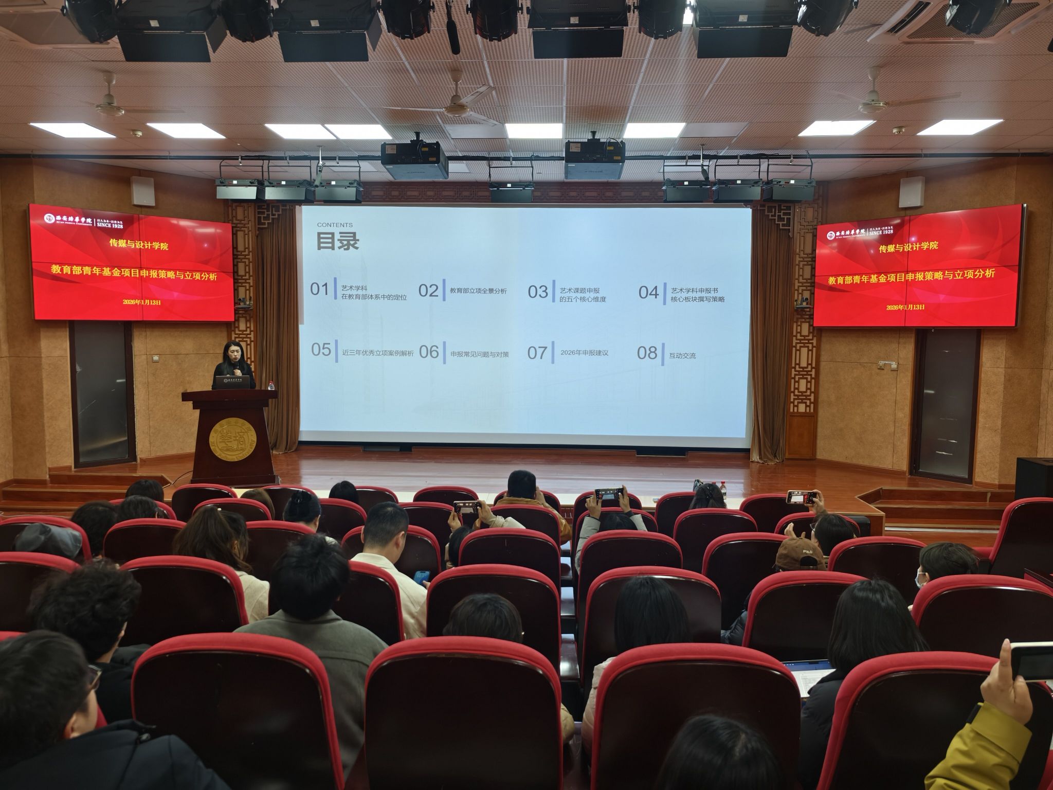 为持续提升学院青年教师科研能力与课题申报水平,助力学院申硕目标实现,2026年1月13日下午,传媒与设计学院在汇知楼国学大讲堂举办了“青年教师科研能力提升”系列讲座第二场。本次讲座特邀陕西科技大学设计与艺术学院副教授、硕士生导师张宇琦博士主讲,主题为”教育部青年基金项目申报策略与立项分析”。讲座由学院科研副院长邵璐主持,学院骨干教师、青年教师及博士共同参与。