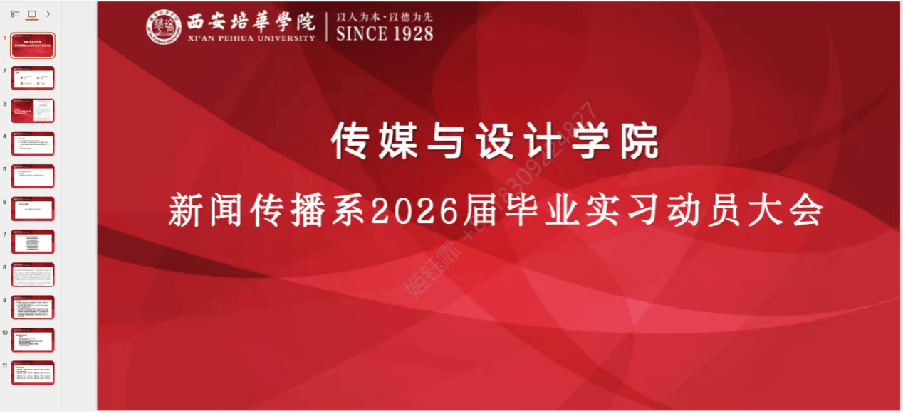 本次动员部署会统一了思想,明确了路径,压实了责任,为新闻传播系2026届毕业生实习工作的顺利开展奠定了坚实基础。下一步,新闻传播系将持续优化实习基地建设与岗位对接,加强过程督导与人文关怀,全力保障学生在专业实践中受教育、长才干、作贡献,为其未来职业发展赋能蓄力。