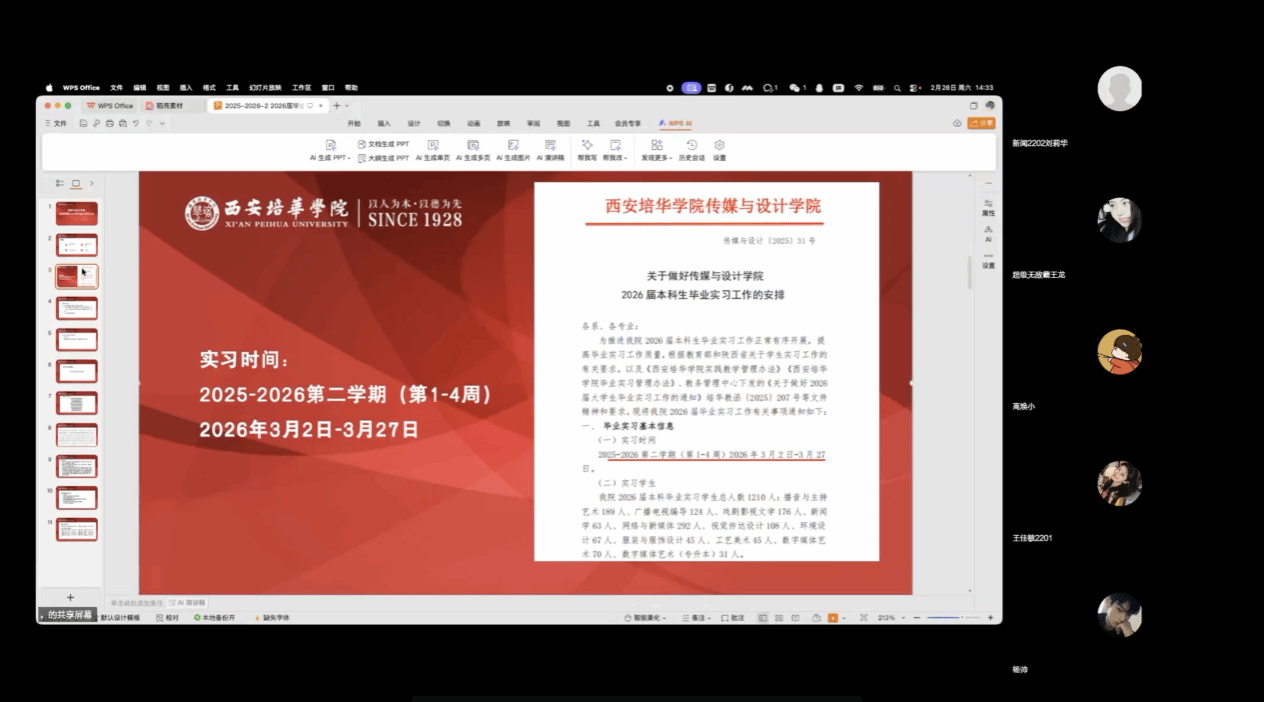 为深入贯彻落实学校应用型人才培养要求,扎实做好毕业实习组织工作,强化实践育人实效,传媒与设计学院新闻传播系于近日组织召开2026届毕业生实习动员与工作部署线上会议。全体实习指导老师共同参会,聚焦实习全过程管理,进行思想动员与专项部署。