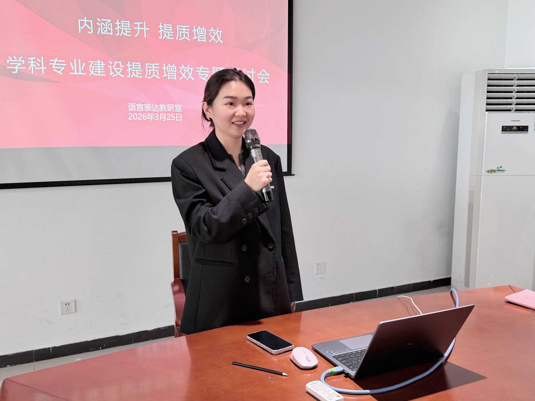 活动伊始,刘玥老师结合语言表达教研室的教学定位与播音专业人才培养核心要求,明确本次教研的核心目标。她提出,语言表达能力是播音与主持艺术专业的立身之本,也是学生核心竞争力的关键所在,新学期教研工作要牢牢扎根课堂教学、课程建设,真正把“内涵提升、提质增效”落到每一门课程、每一次授课、每一项教学细节中。