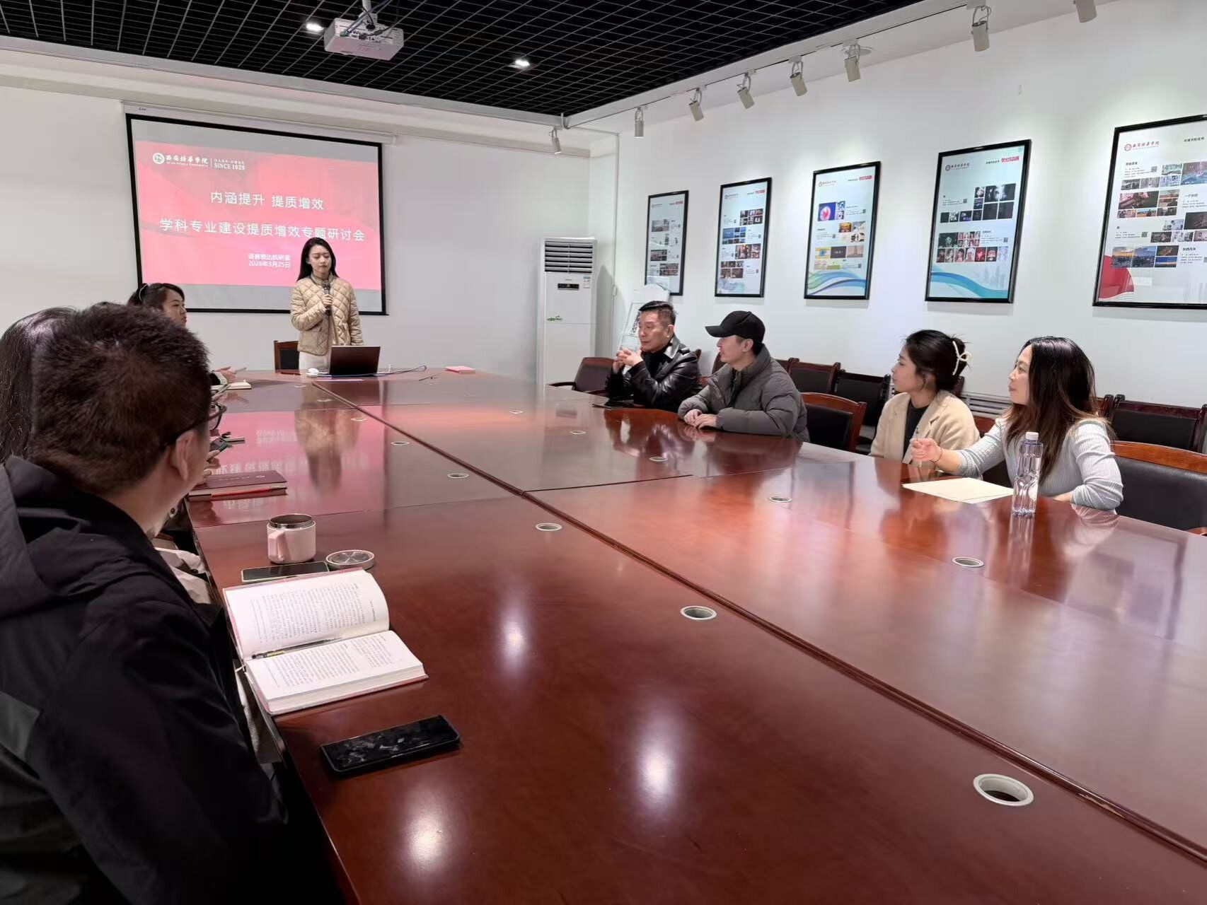 为深入贯彻高等教育内涵式发展要求,精准对接传媒行业人才培养新需求,2026年3月25日13时,播音与主持艺术专业语言表达教研室在汇知楼第四会议室成功举办新学期第一次教研活动。本次活动以“内涵提升,提质增效——学科专业建设提质增效” 为主题,采用专题学习形式深入研讨,由刘玥老师与张笑影老师共同主持,教研室全体教师参会,现场研讨氛围浓厚。