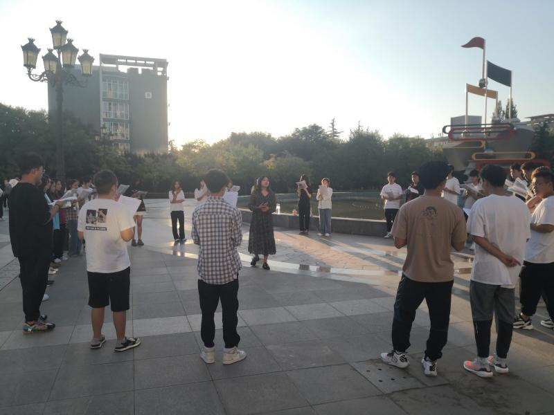 用心吐字用爱归音,唤醒培华学院第一缕阳光的是播音与主持艺术专业大一新生的朗朗之声。9月13号,传媒学院播音与主持艺术专业2021级的萌新们,在系主任尚勇老师和系副主任巨梦老师的带领下,早早便抵达了音乐喷泉广场,开始了他们的大学“第一课”——练声。