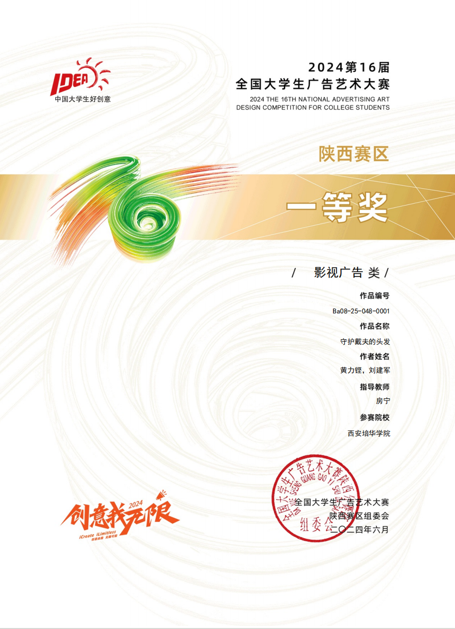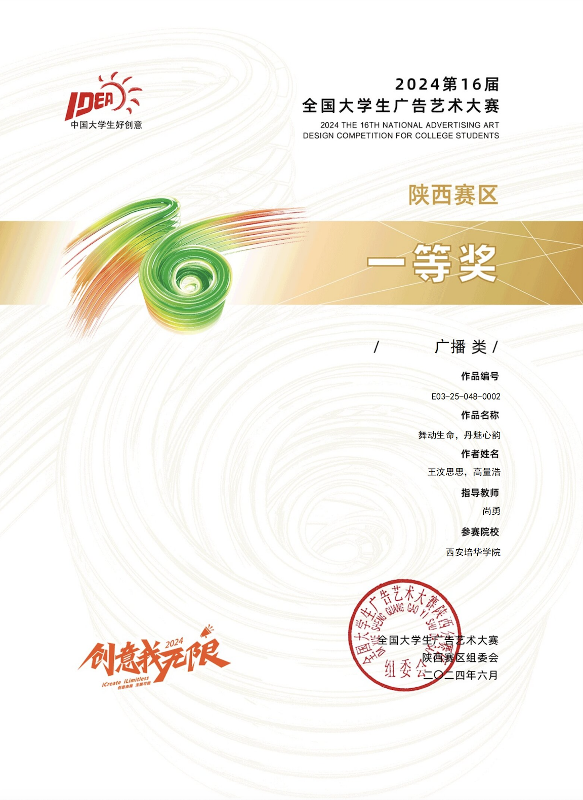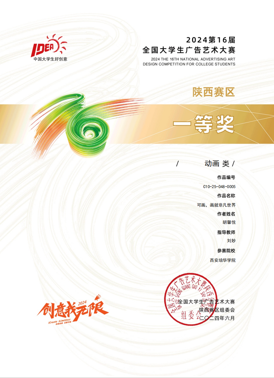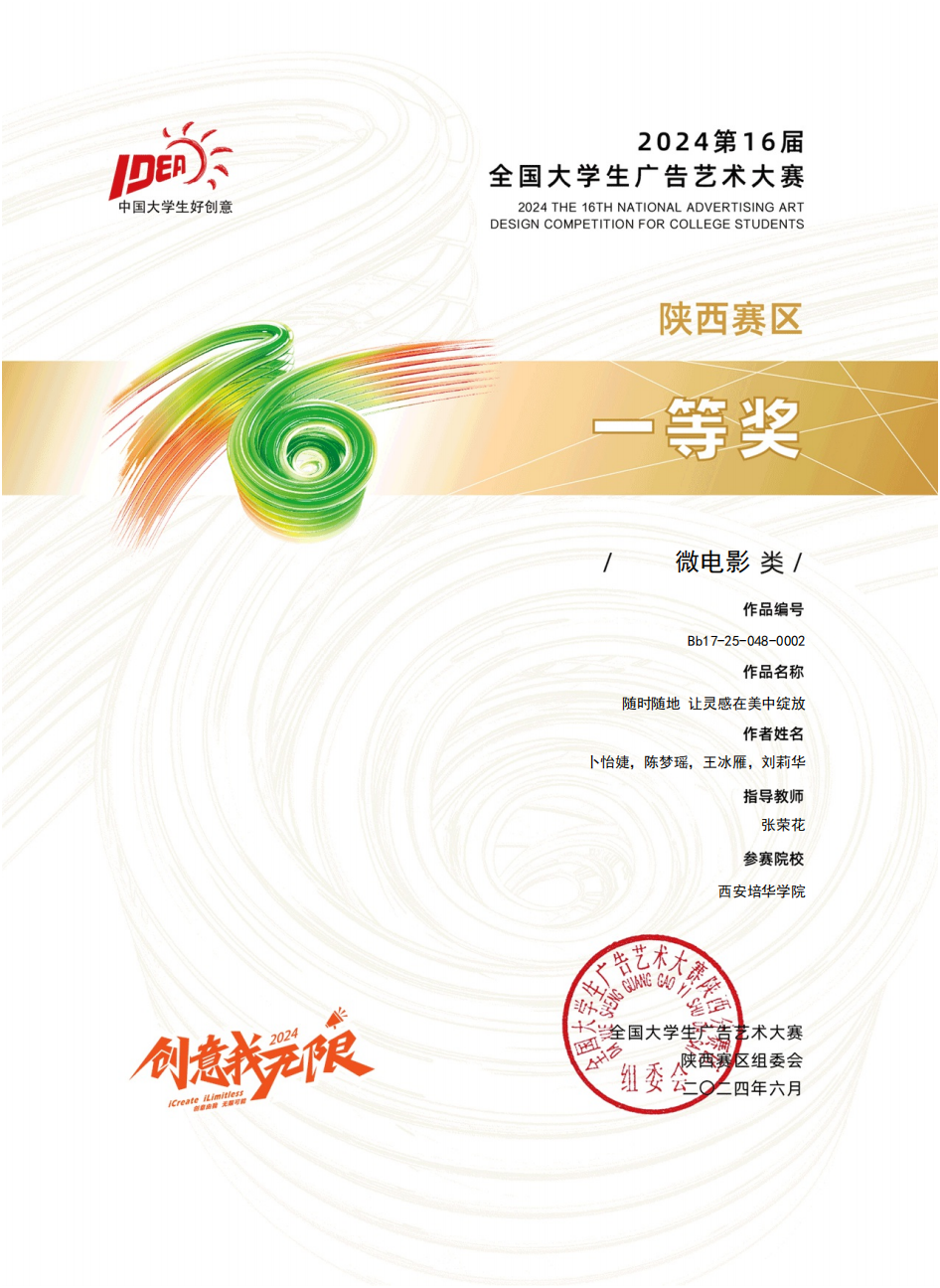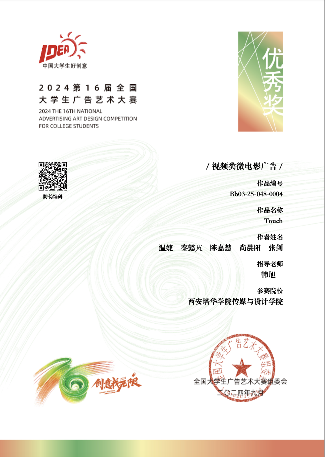 近日,第16届全国大学生广告艺术大赛已顺利结束,本届大广赛陕西赛区参赛作品由各参赛院校进行筛选后,最终报陕西赛区组委会参评作品7265件。其中,我校报送作品146件,获奖71项,荣获国家级三等奖2项,国家级优秀奖2项,陕西省赛区一等奖10项、二等奖14项,三等奖15项,优秀奖28项。西安培华学院荣获“优秀院校奖”,童瑾获“优秀组织工作者”,王卓、张琨、韩旭、曲少为、张荣花、房宁、刘妙、李昕萌、邱晓波、曲少为、郑晓利、吴兰兰、张晓露、尚勇获得“优秀指导教师”称号。