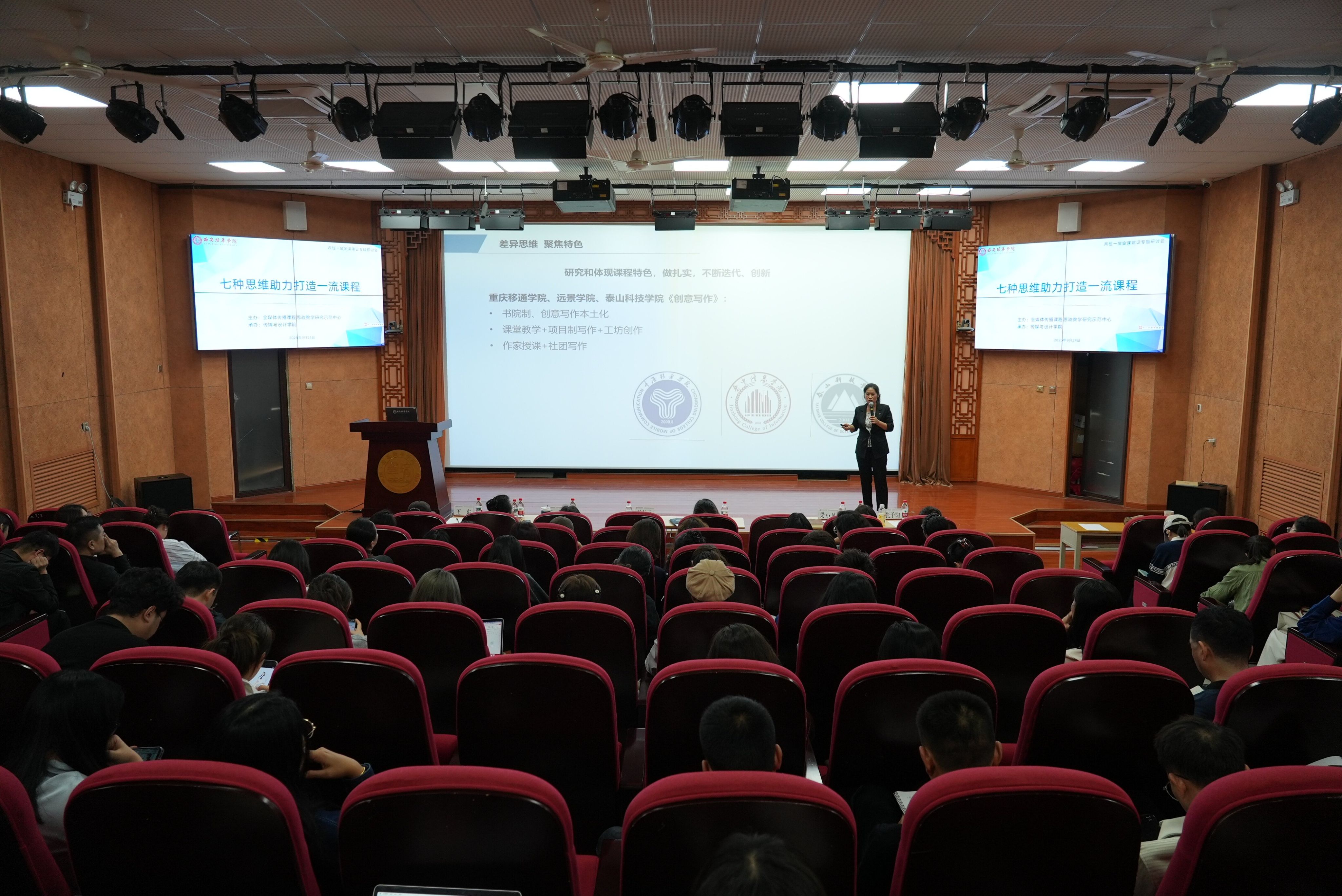 为进一步深入推进课程教学改革,提高课程的高阶性、创新性和挑战度,推动审核评估整改任务落实,淘汰“水课”、打造“金课”,切实提高课堂教学质量和育人水平,由全媒体传播课程思政教学研究示范中心主办,传媒与设计学院承办的“两性一度金课建设”专题研讨会9月24日下午在汇知楼国学大讲堂成功举办。此次研讨会特别邀请了西安欧亚学院副教授、国家级一流课程负责人卢卓元老师作专题分享,活动由传媒与设计学院副院长张荣花主持,学院全体专任教师参加。
