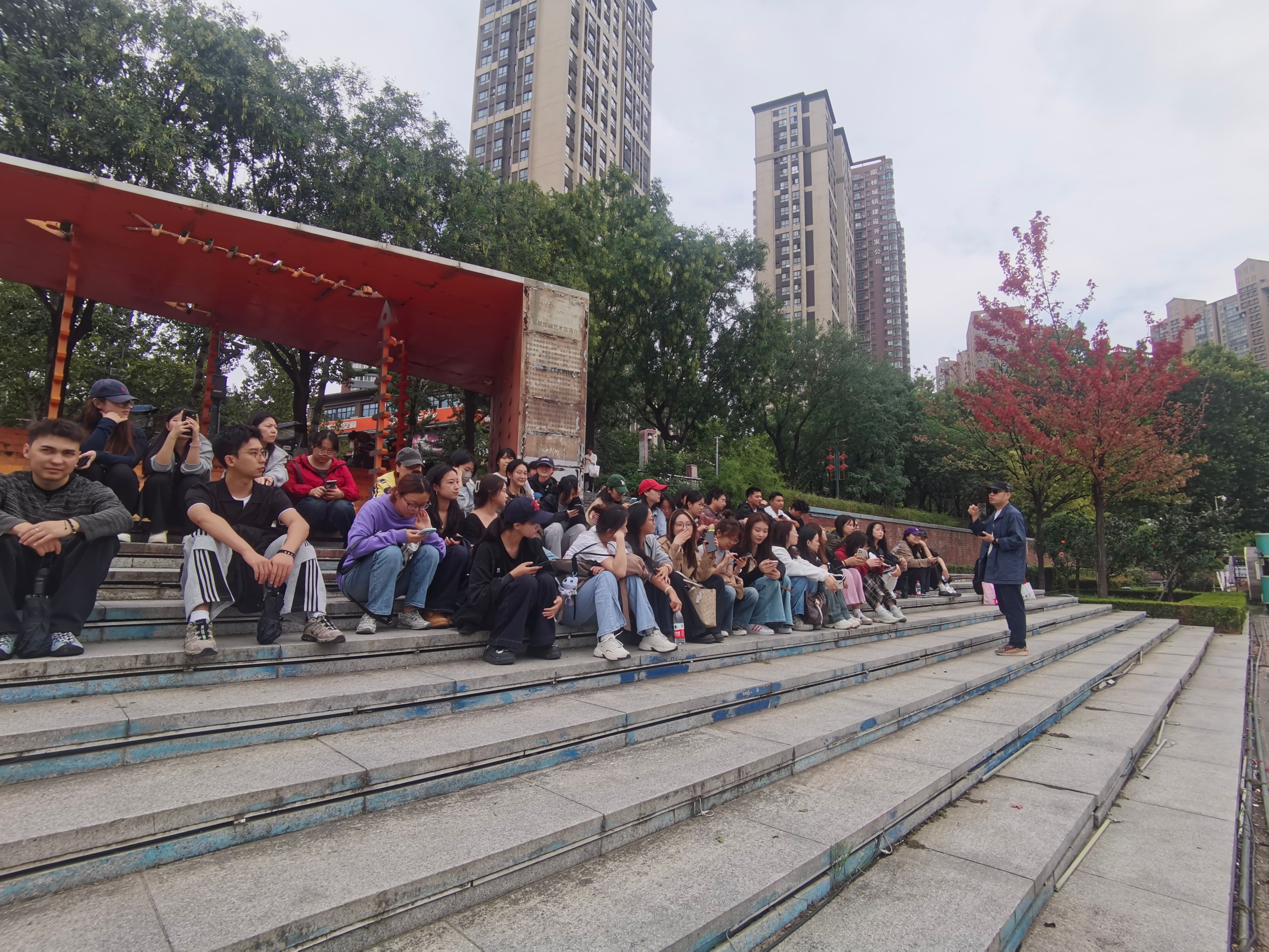 在半坡国际艺术区,师生系统调研了旧工业建筑的结构改造、功能置换与空间重组策略。同学们实地记录透水铺装、垂直绿化等绿色基础设施的应用,分析工业遗存如何通过创意业态植入与公共活动策划实现“空间活化”。有学生感慨:“锈迹斑斑的厂房与玻璃幕墙的并置,不仅是材料的对话,更是时空的缝合。”
