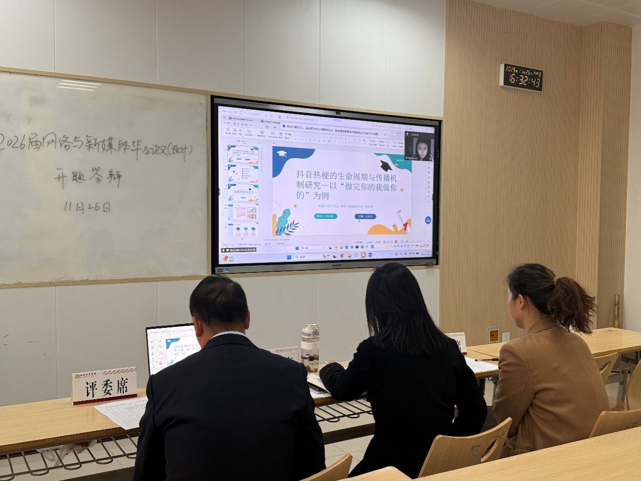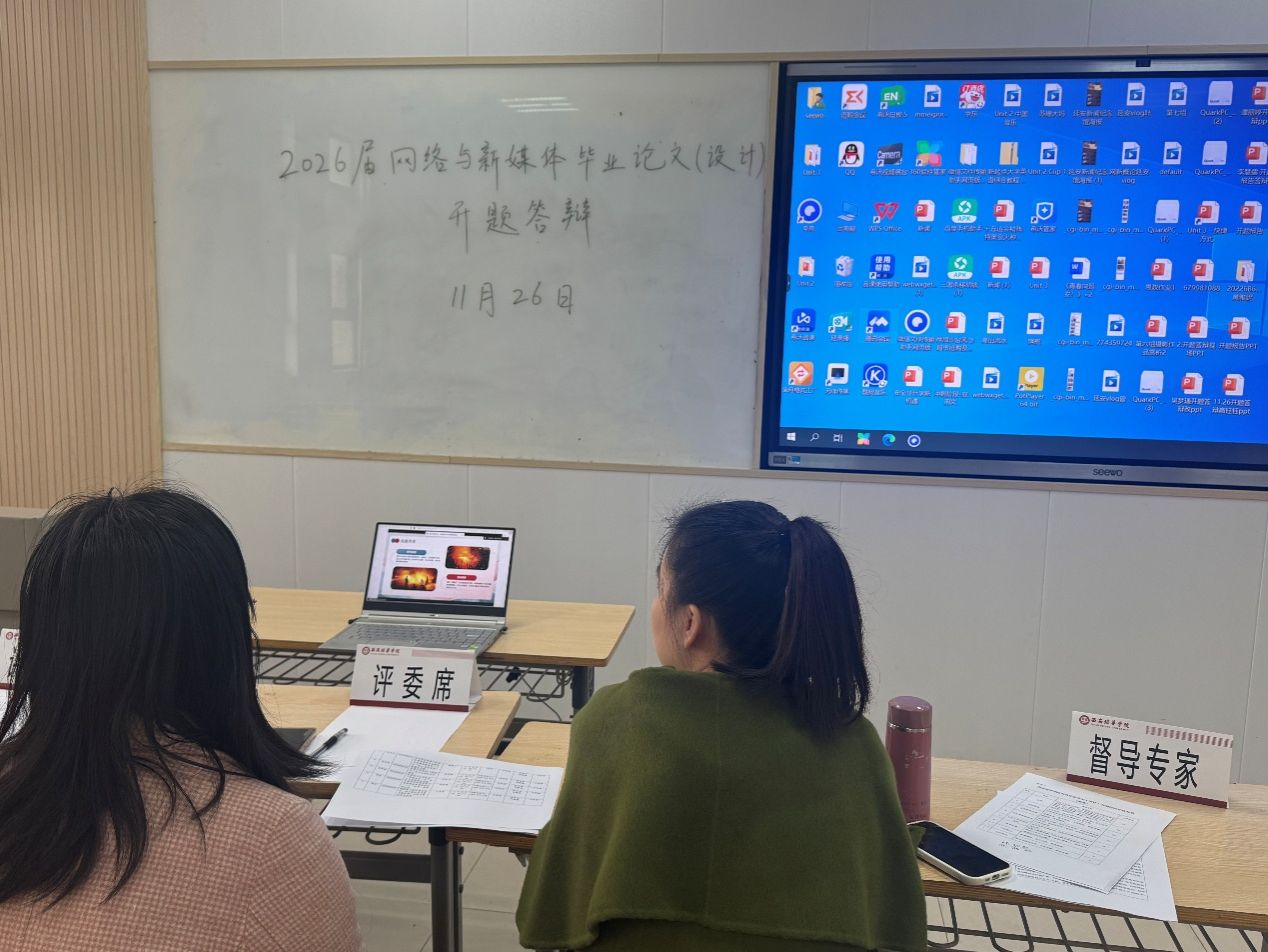 2025年11月26日下午14:30,网络与新媒体专业2026届本科毕业论文(设计)开题答辩在线上与线下同步顺利举行。本次答辩共分为四个小组,整体组织有序,流程规范,全面检验了学生的研究课题可行性和研究方法科学性。