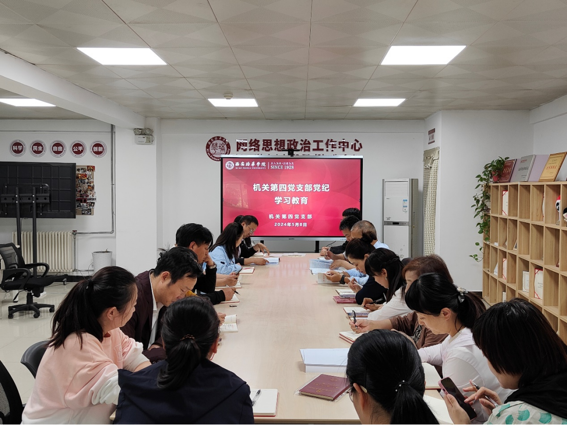 5月8日,机关第四党支部在明德楼二楼网络思想政治教育中心开展党纪学习教育,机关第四党支部22名党员参与学习。此次专题学习会由机关第四党支部书记闵波主持。