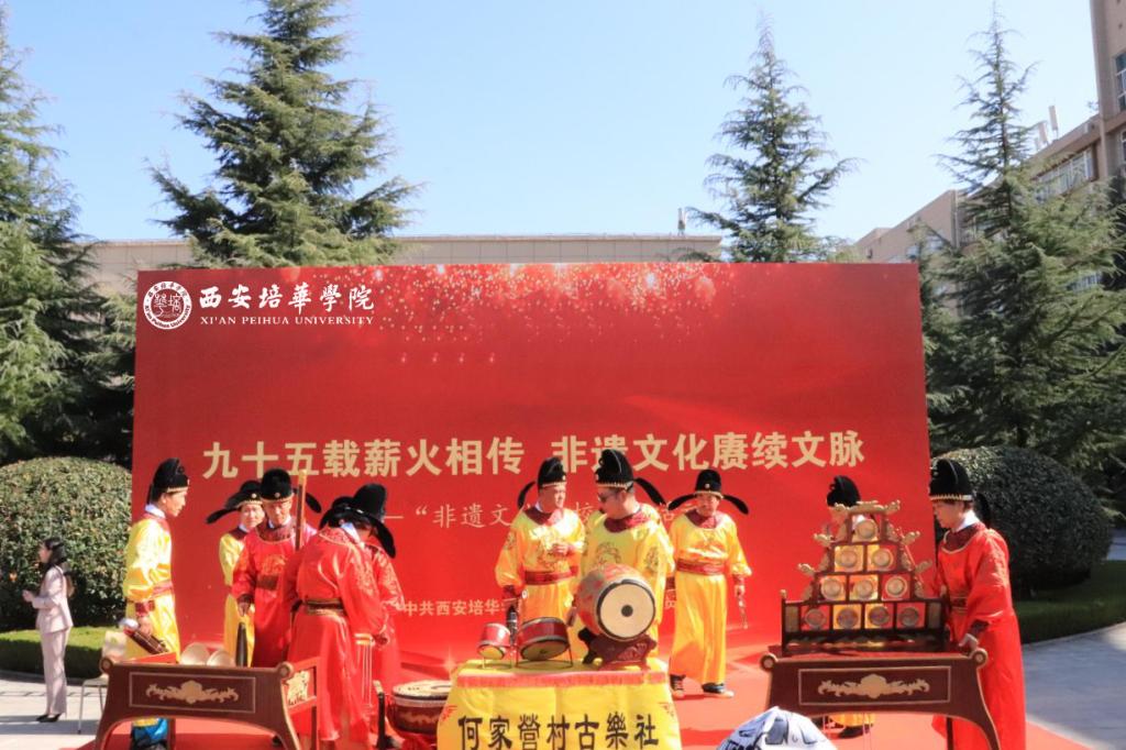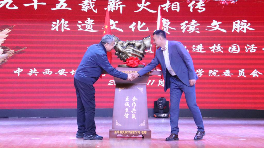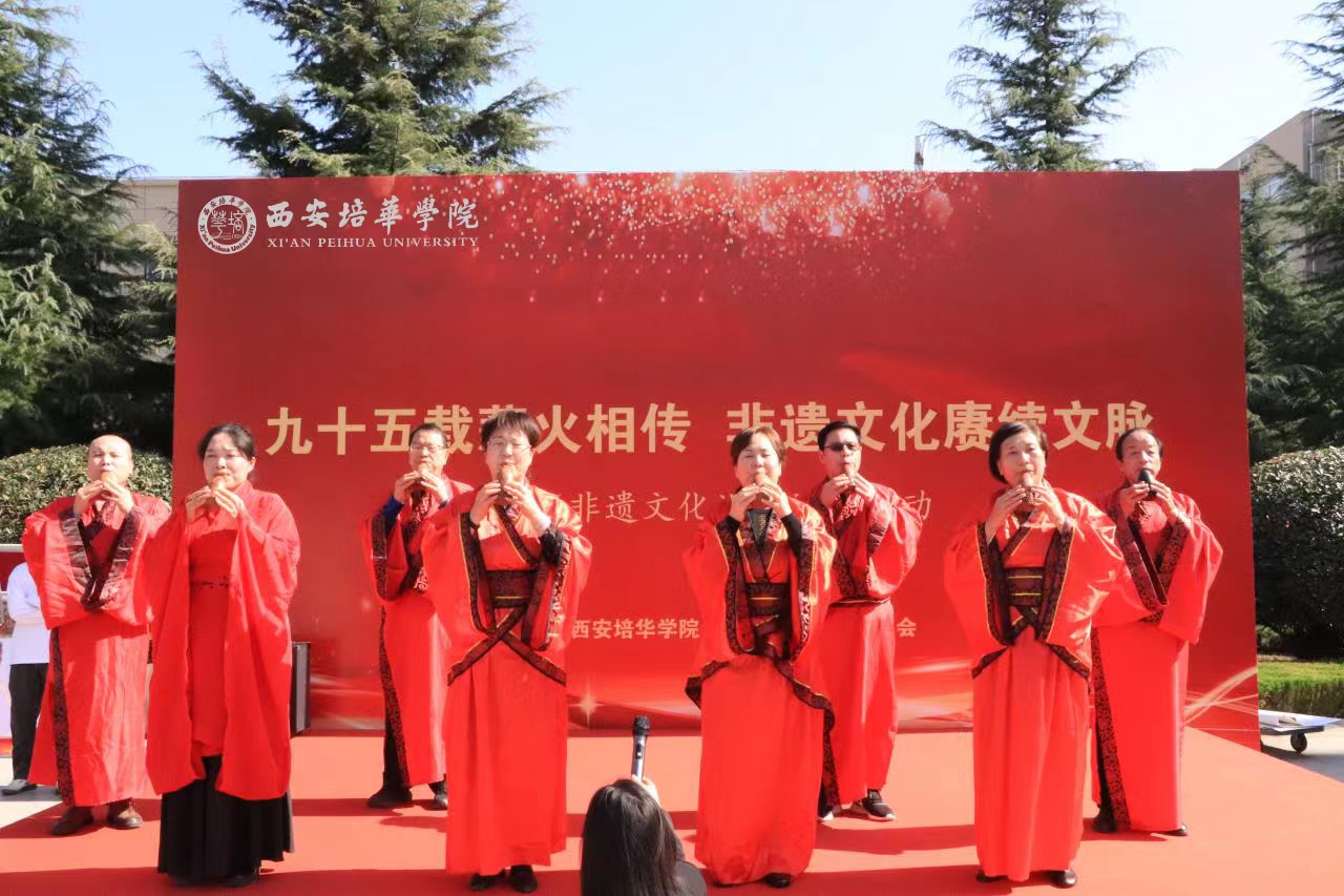 The older artists showed exciting programs such as Huayin Laoqiang, Huashan Opera, shadow puppetry, Shaanbei folk songs, Chang'an black pottery, and drum music to teachers and students. This activity also displayed clay sculpture, rubbing, shadow shadow, black pottery,dough modeling, porcelain, silk flower, cloth mouth gold bag, nuclear carving, paper cuttings and other intangible cultural works in the west square of the school.