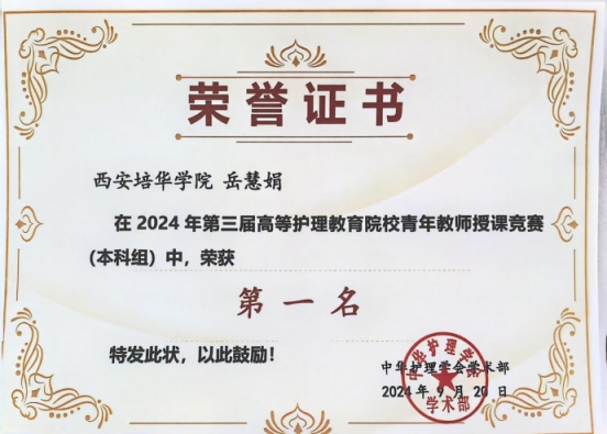 The achievement of this honor is not only the result of Associate Professor Yue Huijuan's relentless efforts but also a vivid manifestation of our university's long-term emphasis on the construction of the teaching staff and the promotion of teaching quality. The high attention and full support from leaders at all levels of the university, departments, and faculties, the meticulous guidance and selfless dedication of many expert professors, as well as the solidarity, cooperation, and strong support from all colleagues in the Nursing Department, have jointly paved a solid path for the success of Associate Professor Yue Huijuan.