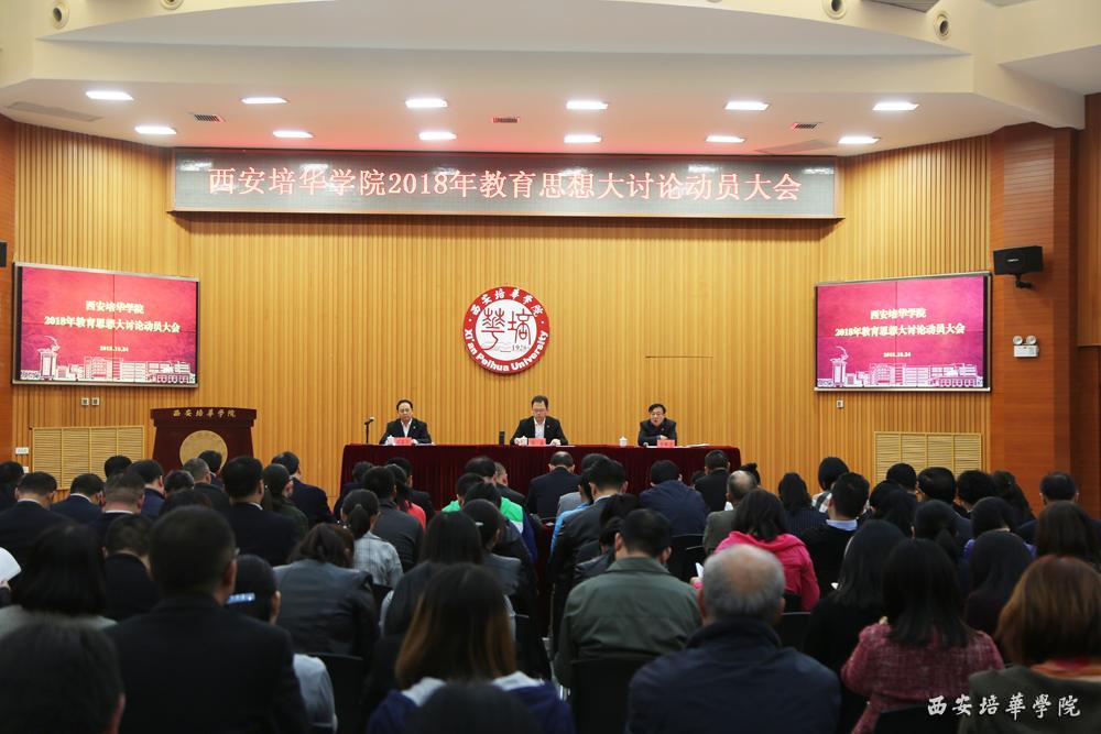 在西安培华学院九十年华诞庆典胜利召开之际,为落实《教育部关于狠抓新时代全国高等学校本科教育工作会议精神落实的通知》(教高函[2018]8号)的要求和全国教育大会会议精神,进一步统一思想、更新观念、提高认识,破解发展难题,扎实推进教育教学改革,提高应用型人才培养质量,学校于2018年10月24日下午在明德楼报告厅召开了教育思想大讨论活动动员会,全体校领导、校学术委员会委员、各二级学院党政干部、系主任、教学干事、学生干事、行政部门主管以上人员参加会议。西安培华学院党委书记胡俊生主持会议。