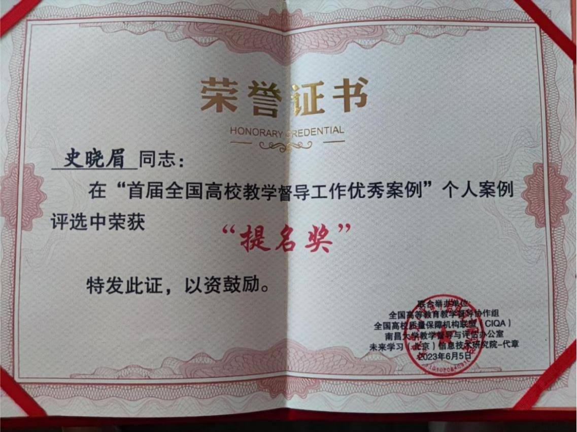 大会组委会根据评价结果,结合陪审团打分原则,综合各位专家意见,确定了获奖名单。我校督导专家组组长史晓眉教授获“首届全国高校教学督导工作优秀案例个人案例提名奖”。陕西民办高校仅有我校获得该奖项。在与全国高校同台竞技、相互交流中,我们既有自信,也找到了差距,这必将推动我校教学督导和质量保障上质量、上水平!