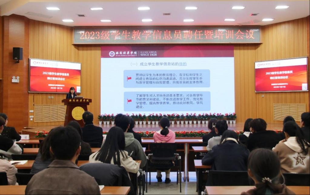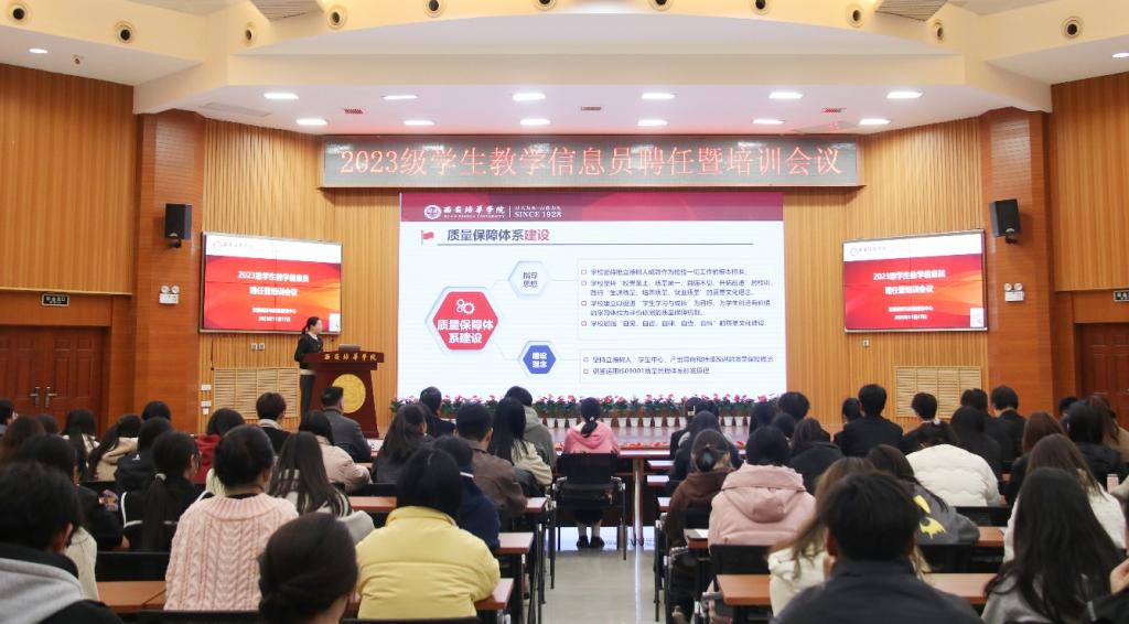 为提高我校学生教学信息员参与教学管理的能力和素质,做好信息收集与反馈工作,持续改进教育教学质量,推进教风、学风建设,发展规划与质量建设中心于11月17日下午,在明德楼报告厅组织召开了2023级学生教学信息员聘任暨培训会议。2023级学生教学信息员近150人参加会议。发展规划与质量建设中心主任助理全婧主持会议。