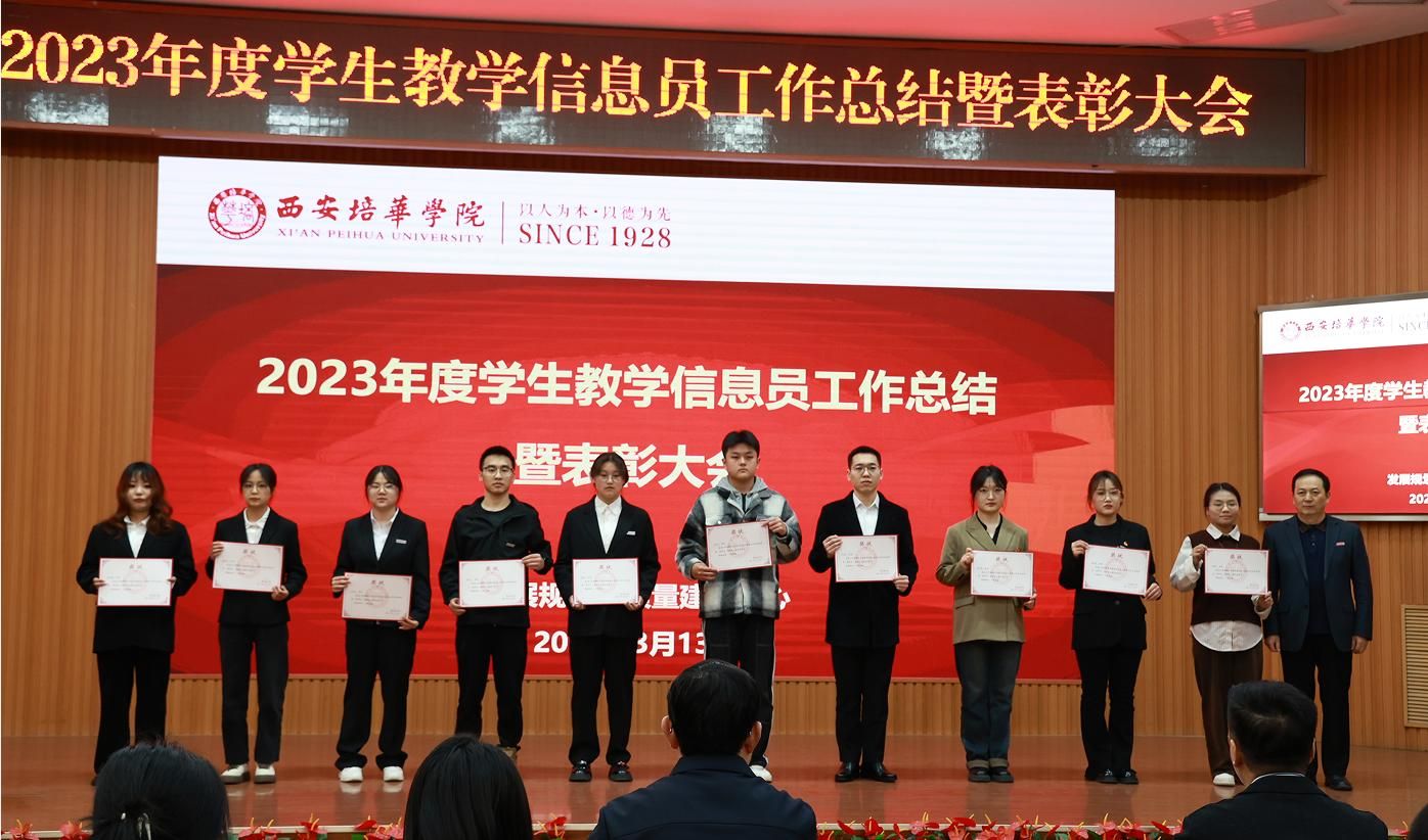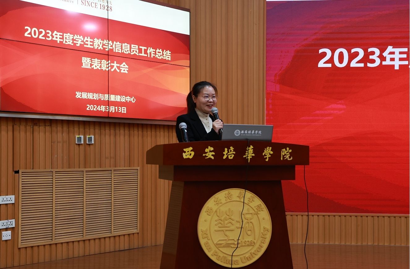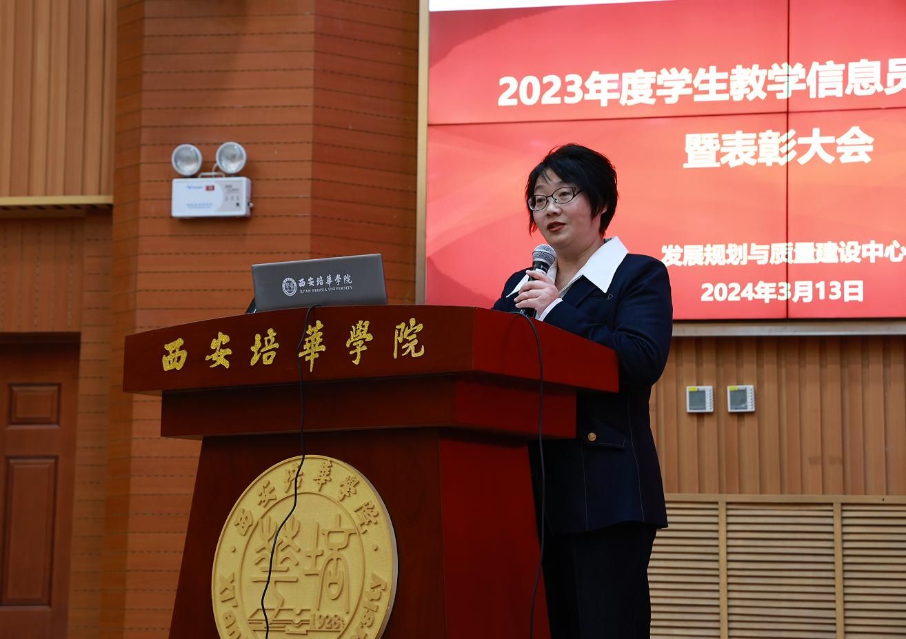 发展规划与质量建设中心主任赵巍宣读了《西安培华学院关于表彰2023年度优秀学生教学信息员的通报》。在热烈的掌声中,常务副校长胡俊生、校长助理鲍伟为优秀学生教学信息员代表颁发了奖状。