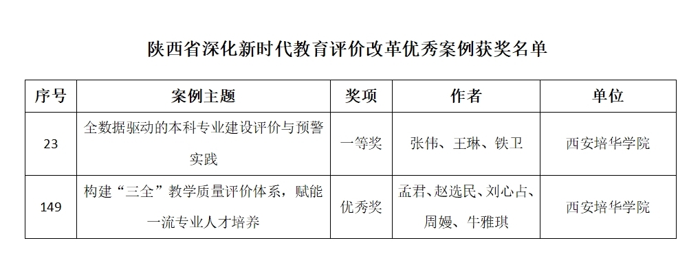 近日,中共陕西省委教育工委、陕西省教育厅下发《关于全省深化新时代教育评价改革优秀获奖案例的通报》(陕教工函〔2024〕346号)文件,我校报送的《全数据驱动的本科专业建设评价与预警实践》案例获评一等奖,《构建“三全”教学质量评价体系,赋能一流专业人才培养》案例获评优秀奖,展现了我校在教育评价改革领域积极探索取得的成效。
