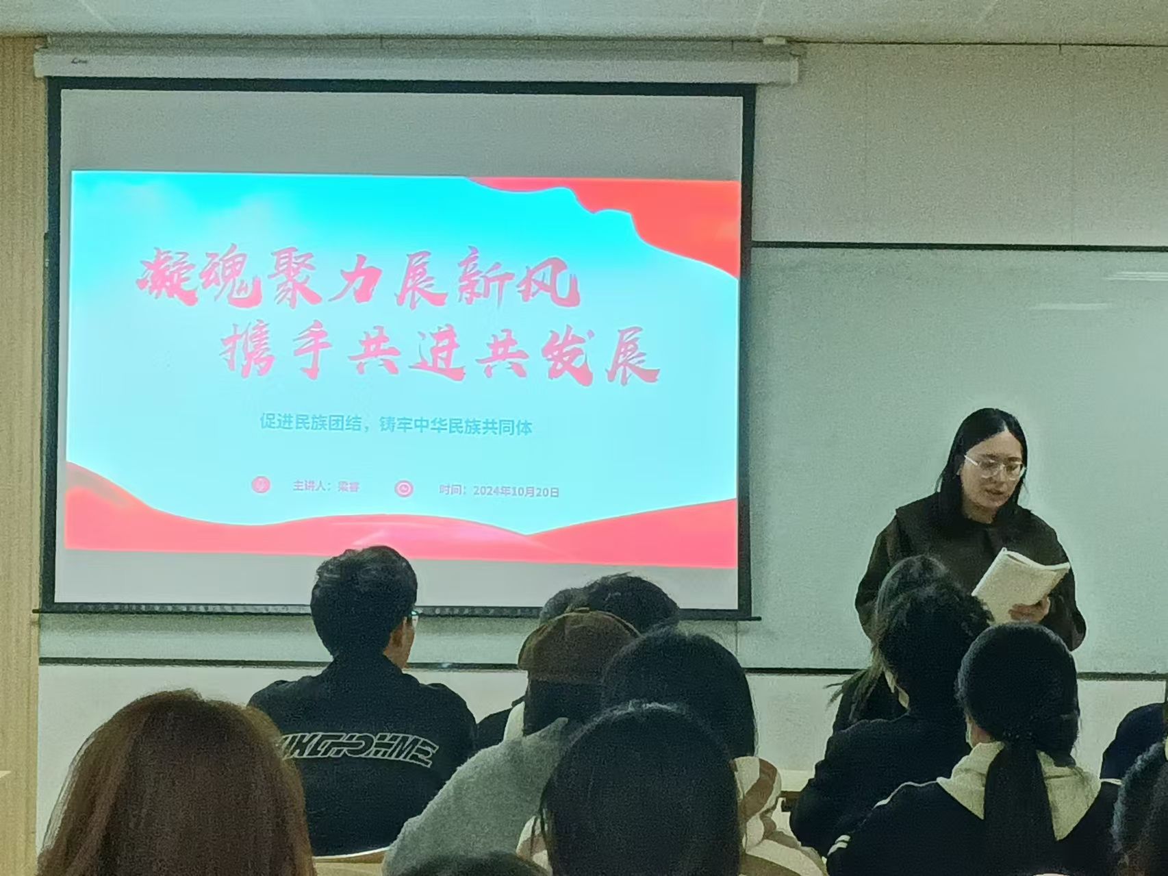 10月20日,法学院学生第三党支部在1617 教室开展了以“促进民族团结,铸牢中华民族共同体——凝魂聚力展新风,携手共进共发展”为主题的民族团结爱国主义教育宣讲活动,学生第三党支部书记梁睿老师作主题宣讲。