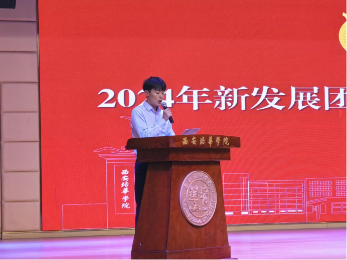 党总支书记韩斌为新团员颁发团徽及团章并寄语全校团员青年,要不忘初心、牢记使命,以更加饱满的热情投身学习和工作,为个人的梦想奋斗,为祖国的发展奉献。并由团委组织部部长张辉领誓。在宣誓环节,新团员们在团旗前庄严宣誓,表达了自己作为一名共青团员的自豪感与使命感。他们的誓言铿锵有力,展现了新一代青年的坚定信念和对未来的无限憧憬。仪式上,还特别邀请了优秀团员代表发言。他们分享了自己在团组织中的学习经历和成长故事,鼓励新团员们积极参与团组织活动,不断提升自我,为社会、为集体贡献力量。