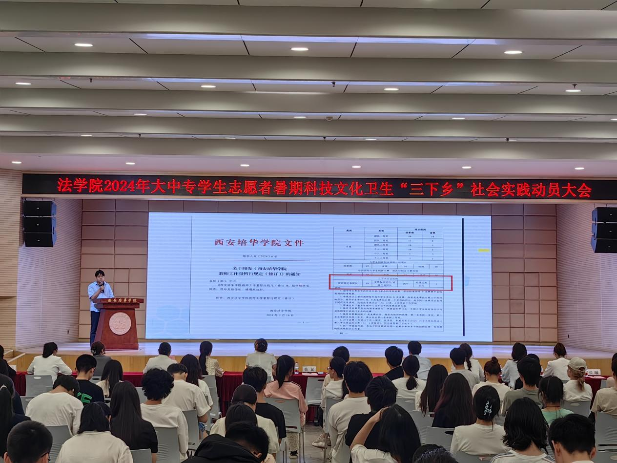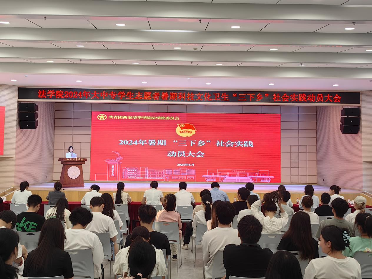 为全面启动和部署2024暑期“三下乡”社会实践活动,确保实践育人成效,法学院团委于2024年6月5日晚19:00在恒友楼四楼报告厅召开2024年暑期“三下乡”社会实践动员大会。法学院党总支书记兼行政副院长韩斌,法学院副院长赵洁,校团委工作服务部部长王朋,公法教研室主任李倩,理论法教研室主任罗静,法学院团委书记马亮,以及指导教师代表、辅导员代表和200余名学生参与此次大会。