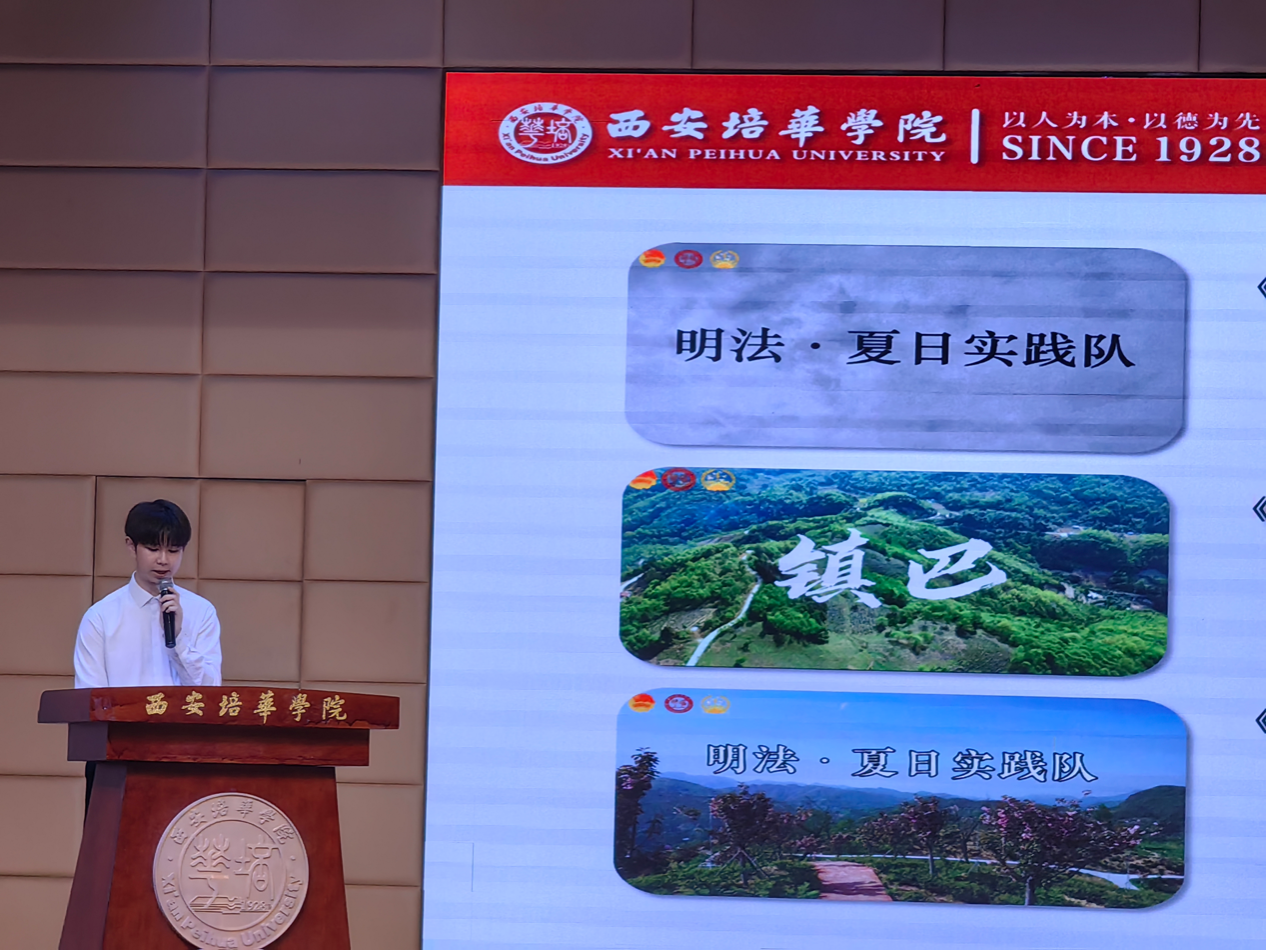 张辉同学作为学生代表,分享了他参与2023年暑期三下乡社会实践活动的经历。他详细地讲述了法治中国青春行和文明实践看陕西这两个专项行动的全过程,包括项目的立项筹备、具体的开展方式以及活动结束后的总结工作。张辉同学的讲解不仅让同学们对这些活动有了更深入地了解,也激发了大家参与社会实践的热情。他呼吁同学们积极参与2024年的三下乡活动,通过亲身实践来增强法治意识,传承文明精神,为推动乡村振兴贡献青春力量。
