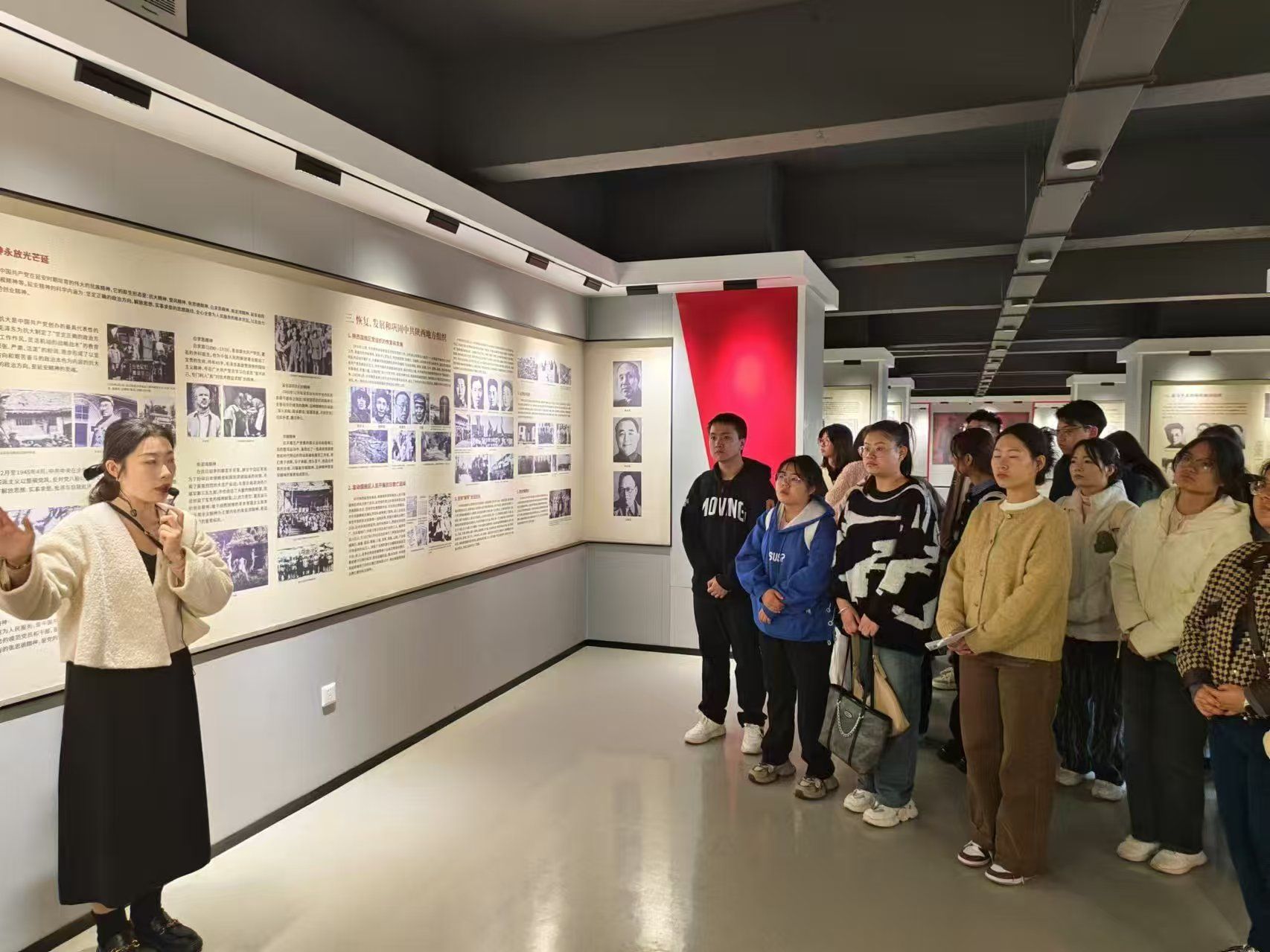 11月15日,法学院党总支组织52期发展对象在博远楼三楼“信仰之光”红色文化展厅进行红色文化实践教学活动。同学们传颂革命先烈浴血奋战的英雄事迹,感受那红色文化和爱国主义于一体的红色传承,通过讲解,了解一段艰难岁月,学习革命先辈团结抗战、不怕牺牲、无私奉献、艰苦奋斗的抗战精神。这有助于铭记历史,珍惜来之不易的和平生活,将以先烈为榜样,热爱学习,加强修养,勇敢面对学习和生活中的挑战,为梦想而奋斗。