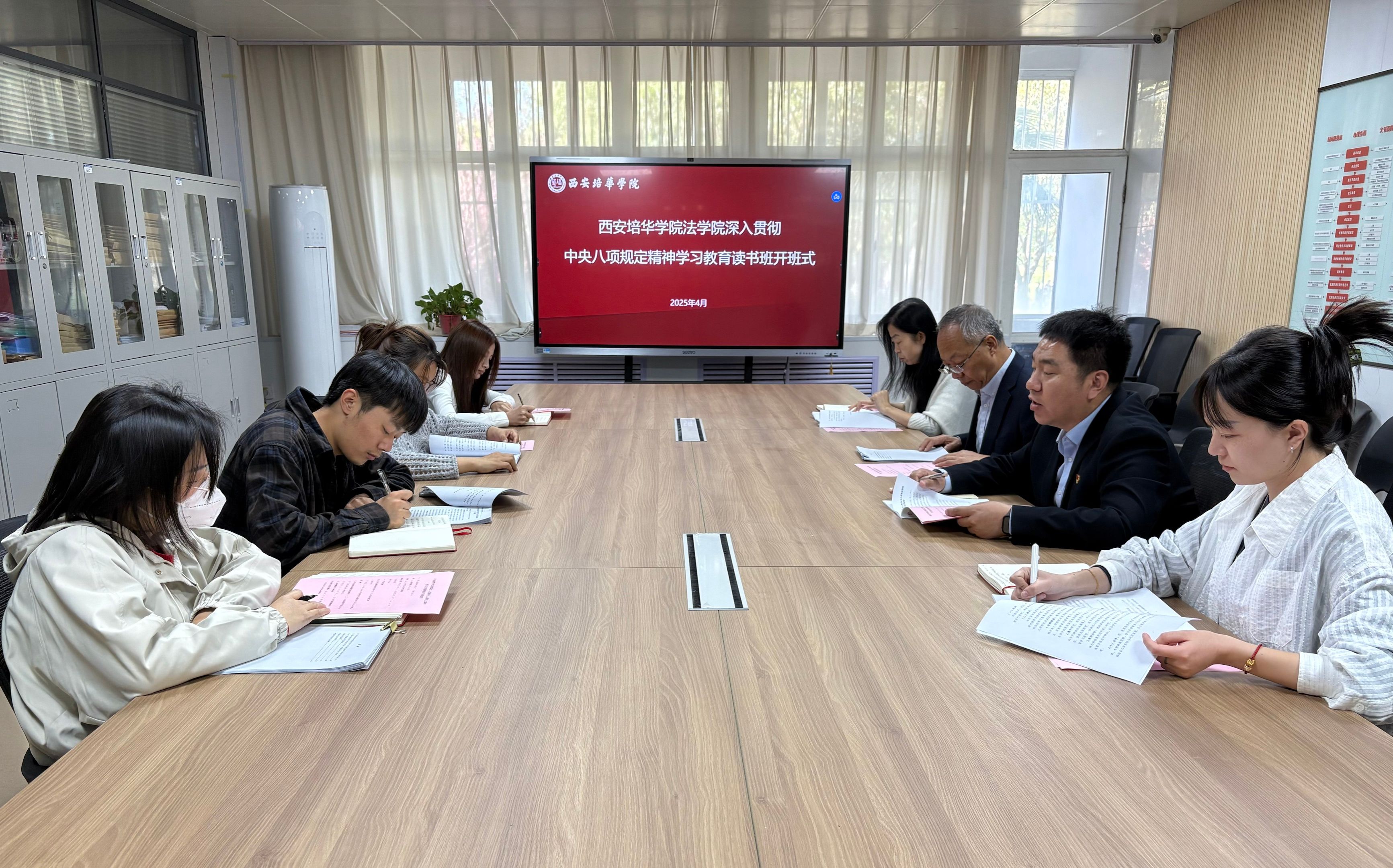 为深入学习贯彻习近平总书记关于加强党的作风建设的重要论述,认真学习领会中央八项规定及其实施细则精神,西安培华学院法学院于2025年4月14日举办了深入贯彻中央八项规定精神学习教育读书班。学院领导班子成员、办公室主任、团委书记、党务干事和党支部书记参加,学院党总支书记韩斌主持。