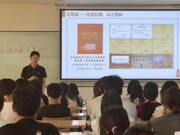 为彰显优秀学生党员先锋形象,凝聚榜样力量,培育学生敢为人先、勇于探索的意志品质,着力培养堪当时代重任的“敢为人先、勇于突破”新时代好青年,6月10日,法学院党总支在2612教室组织开展“以法为翼,筑梦未来”优秀学生党员成长经验分享会。中共党员、国家奖学金获得者左浩宇同学担任主讲人,第53期积极分子、发展对象参加会议。