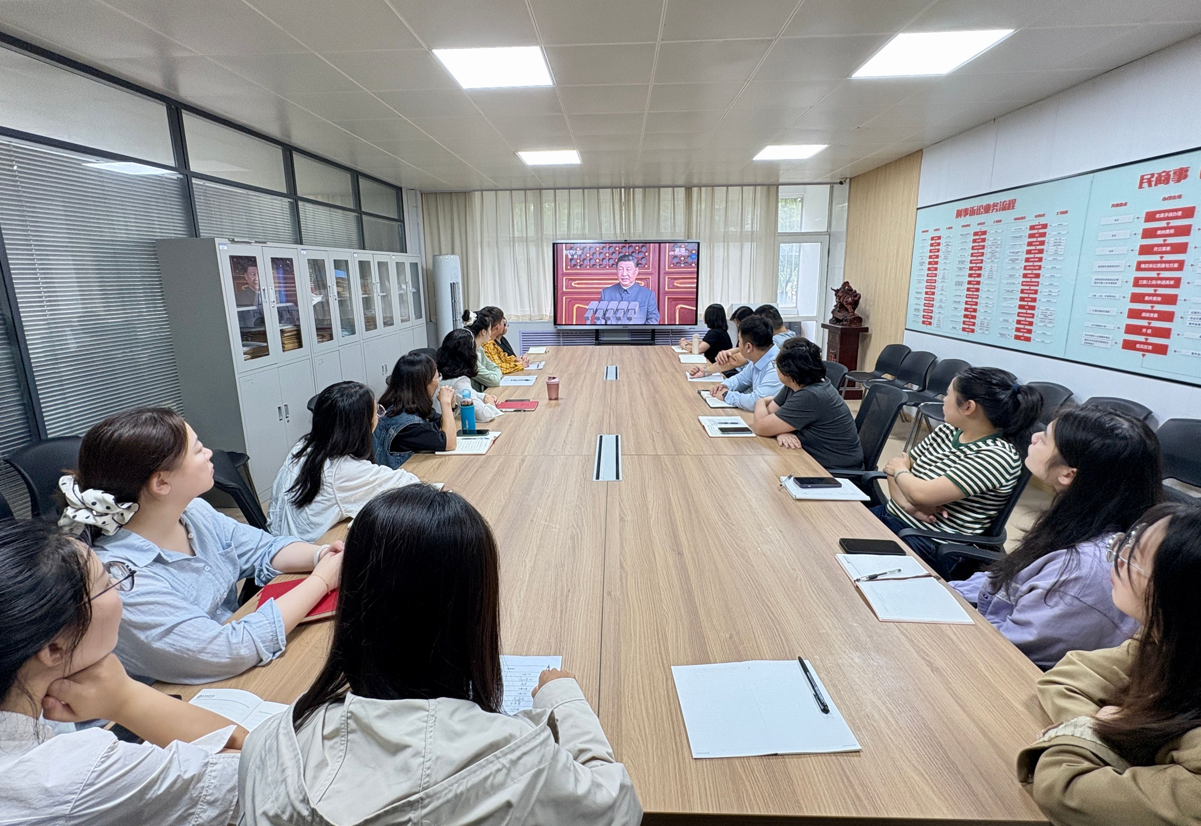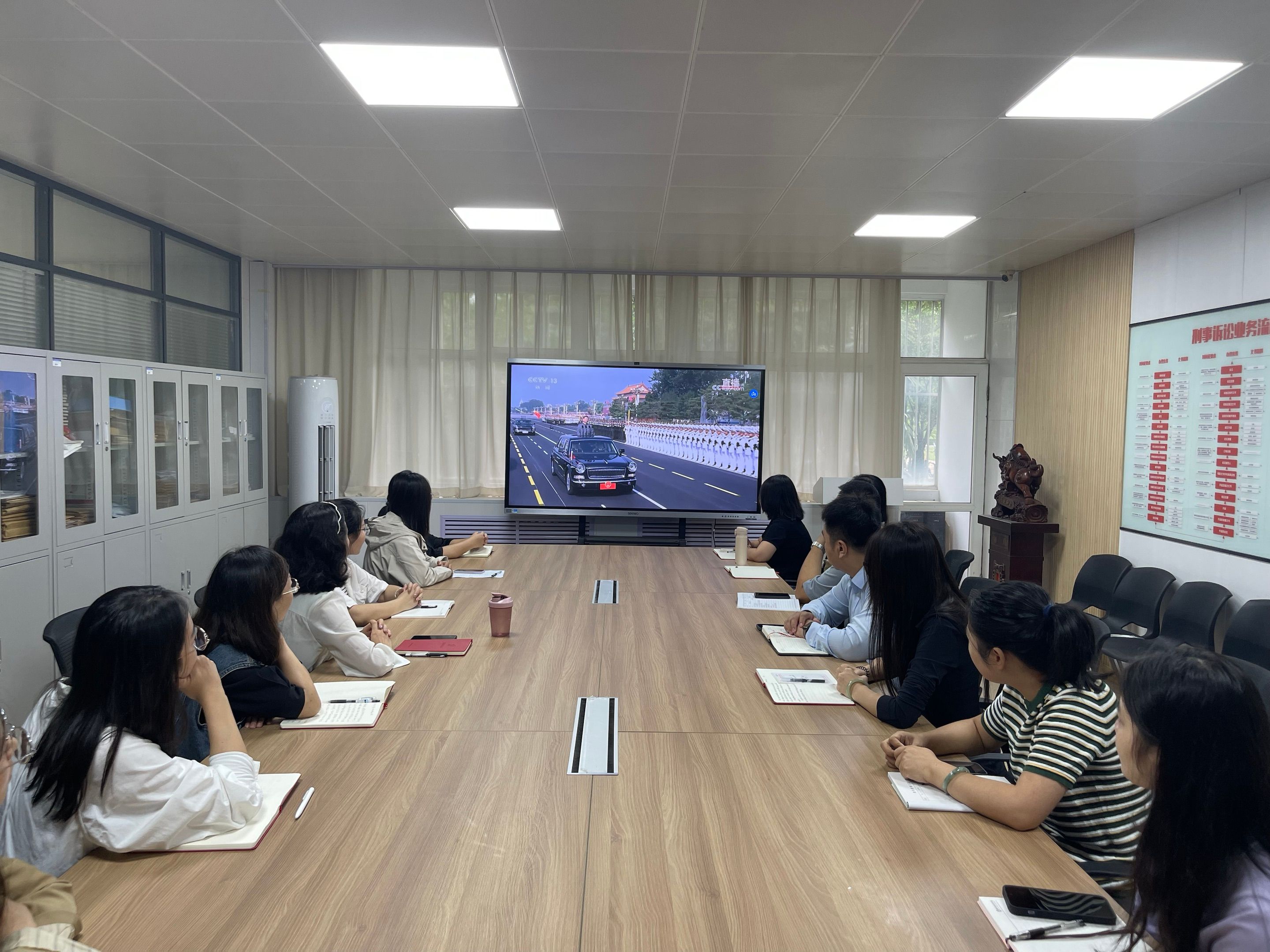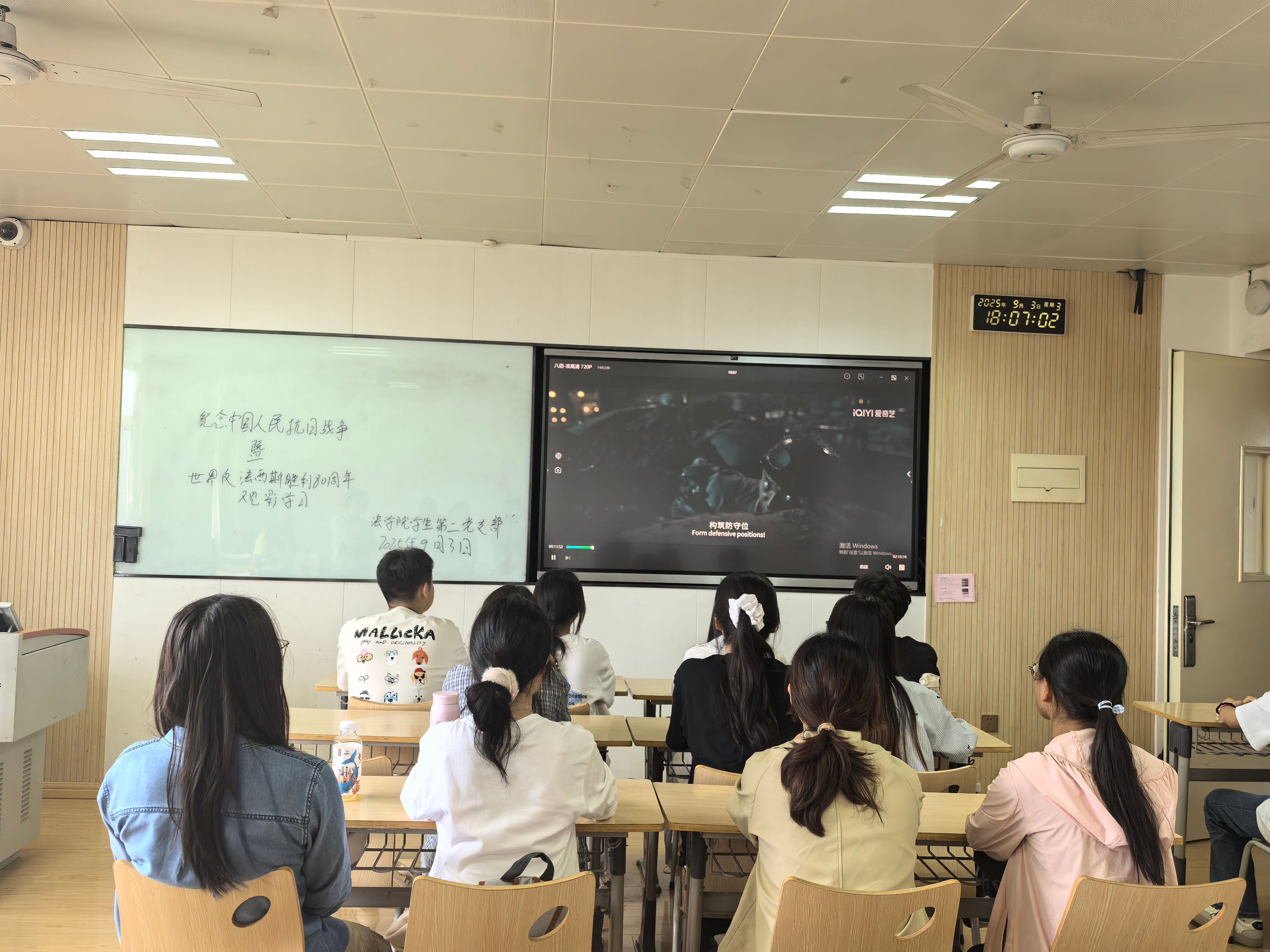 9月3日,应学校安排,法学院党总支各支部书记与党务干事在图书馆报告厅集中观看纪念中国人民抗日战争暨世界反法西斯战争胜利80周年阅兵式直播,以庄严仪式缅怀先烈、弘扬伟大抗战精神,激发师生爱国情怀。