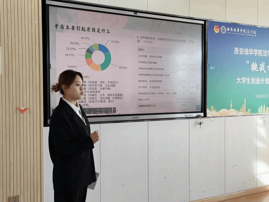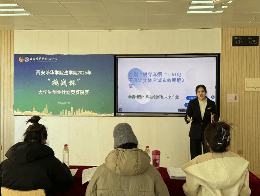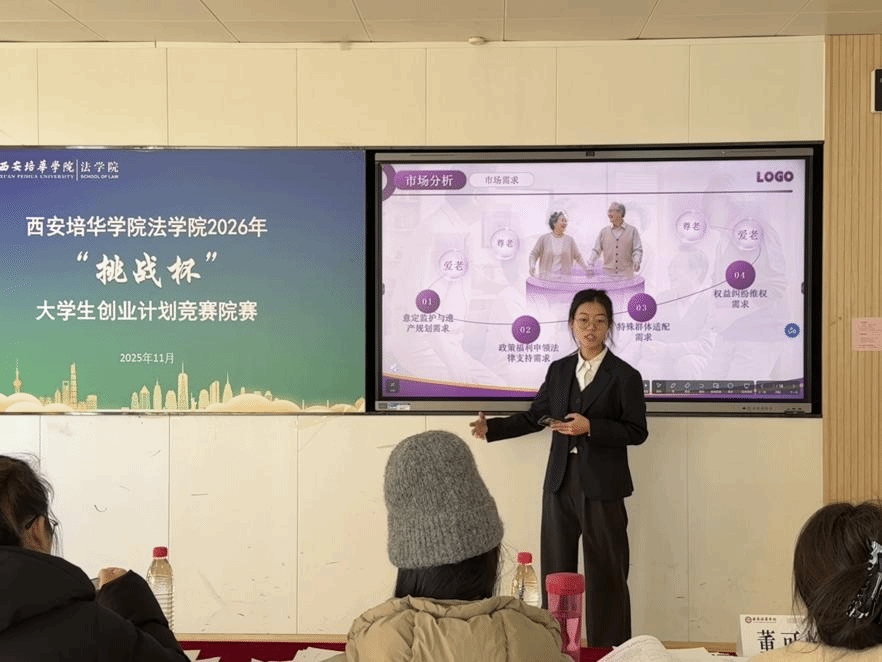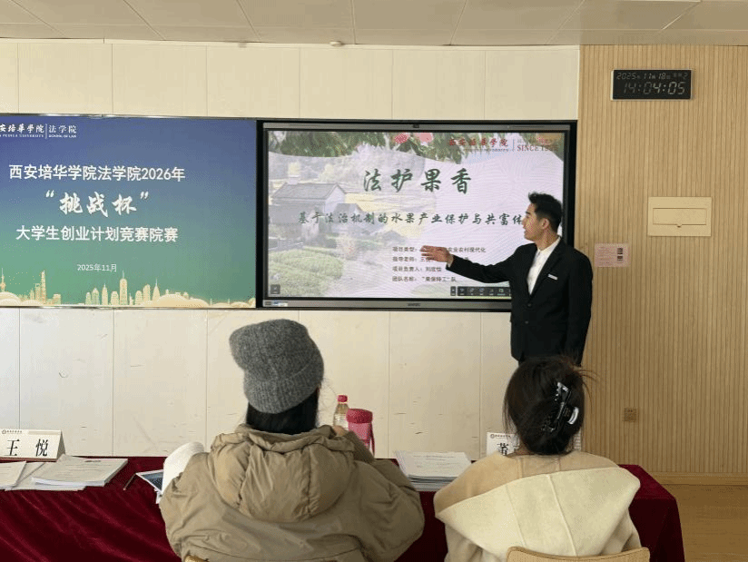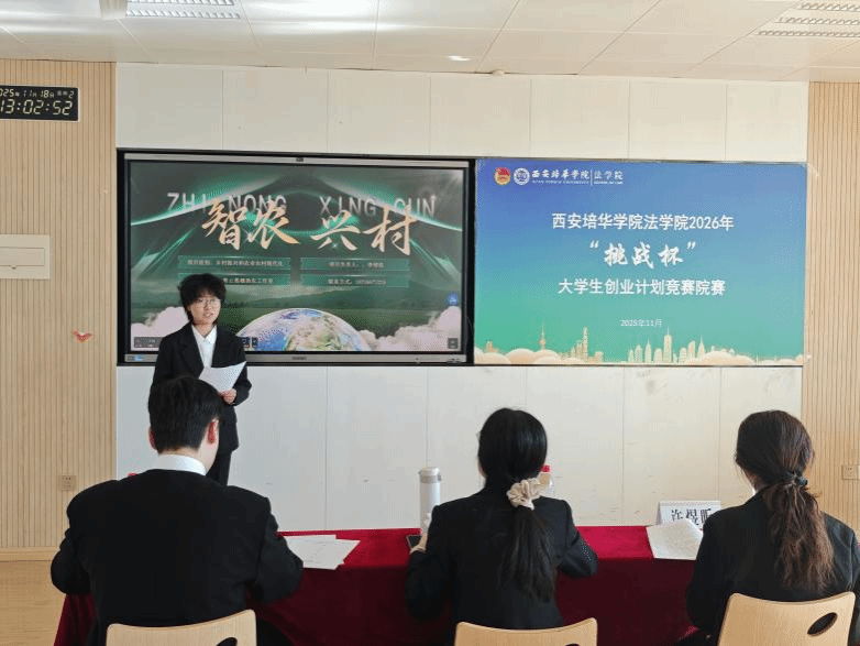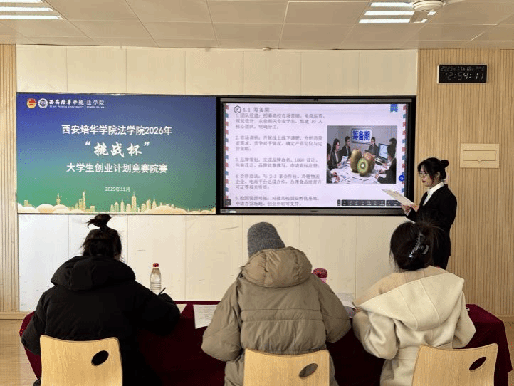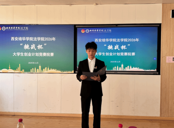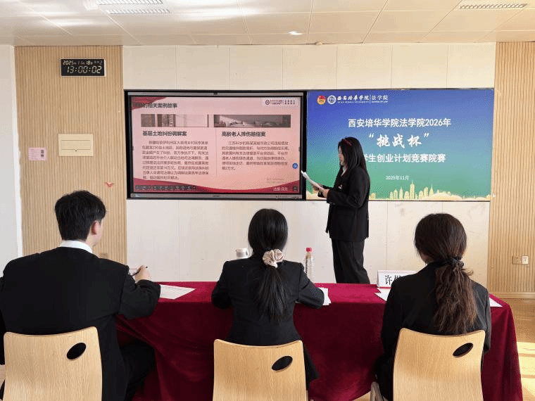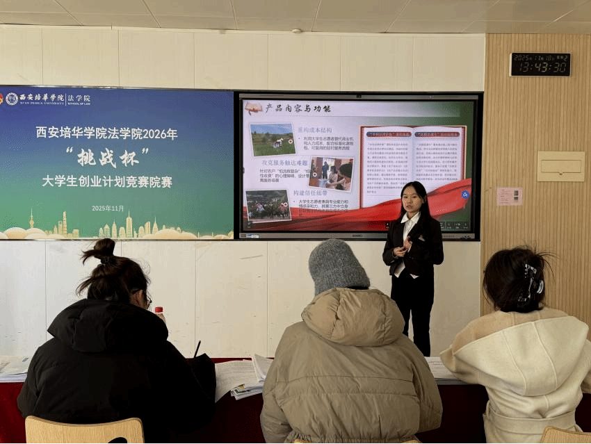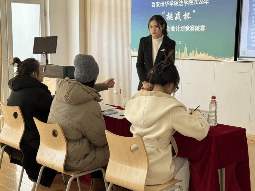 为深入学习贯彻习近平新时代中国特色社会主义思想,凝聚青年力量,引导青年学生聚焦时代痛点,创新创业解决社会热点问题,西安培华学院法学院于2025年11月18日在格物1607、1608教室开展西安培华学院法学院2026年“挑战杯”大学生创业计划竞赛院赛。此次比赛共23个团队参赛,评委由创新创业教研室主任江凤香,法学院理论法教研室教师王悦,法学院团委书记董可怡,团委副书记赵玉洁、铉佳霖担任,由法学院习近平法治思想宣讲团干事王梦颜、刘柏驹主持。