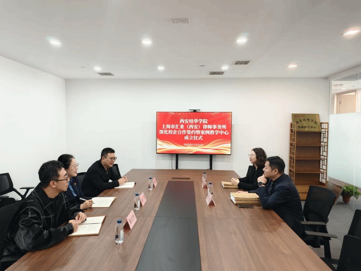 2025 年 11 月 11 日上午,西安培华学院法学院与上海市汇业(西安)律师事务所深化校企合作签约暨案例教学中心成立仪式在该律所举行。西安培华学院法学院副院长赵洁,法律实务教研室教师马亚乐、裴文杰、上海市汇业(西安)律师事务所副主任惠超、律师程园园出席仪式。