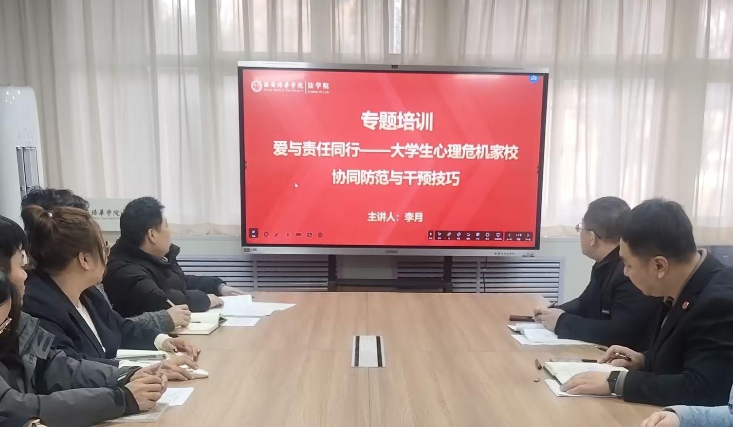 为健全大学生心理健康教育家校协同机制,提升辅导员家校沟通能力,切实筑牢学生心理健康“防护墙”,3月12日,法学院举办大学生心理危机家校协同防范与干预技巧专题培训。学院辅导员参与本次培训。