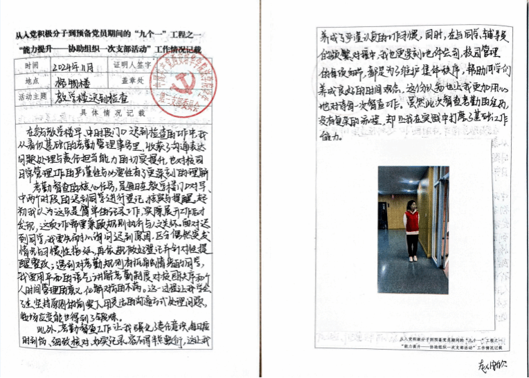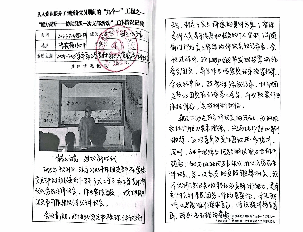 钱怡嘉在组织开展活动后感慨道:“这是一次深刻的精神洗礼与能力锻炼。在活动筹备与开展中,我深入学习姜维之先生的教育信念与奉献精神,也在组织协调中提升了策划执行与文化传播能力。此次活动让我明白,传承先辈精神要付诸行动,青年需将精神力量转化为学习工作动力,以担当实干为校发展、民族复兴贡献青春力量。”赵慧颖结合专业学习感悟:“参与推优入党民主评议会组织工作,于我是专业与党性的双重历练。从梳理评议流程到把控票选细节,既锻炼了组织协调力,更让我以法治思维理解党内民主程序的严谨性。启示我们要以严谨细致守好程序正义,在锤炼党性中精进专业,坚持为人民为中心,用专业能力服务社会公平正义。