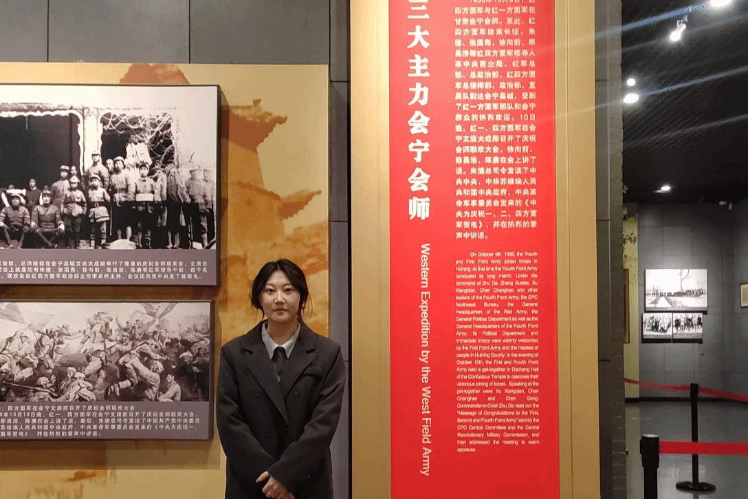 在实践期间,我具体参与了以下活动:我首先学习了习近平总书记《论党的青年工作》中的重要篇章。这部著作不仅是新时代党的青年工作的根本遵循,更是一盏指引青年成长的明灯。在随后的学习中,她结合书中关于“培养什么样的青年、怎样培养青年”的深刻论述,表达了要将“小我”融入祖国和人民的“大我”之中。理论学习后,我前往甘肃会宁红军长征胜利纪念馆进行实地研学。在一件件珍贵的革命文物和一幅幅泛黄的历史照片前,我驻足凝视,仿佛穿越回那段波澜壮阔的峥嵘岁月。