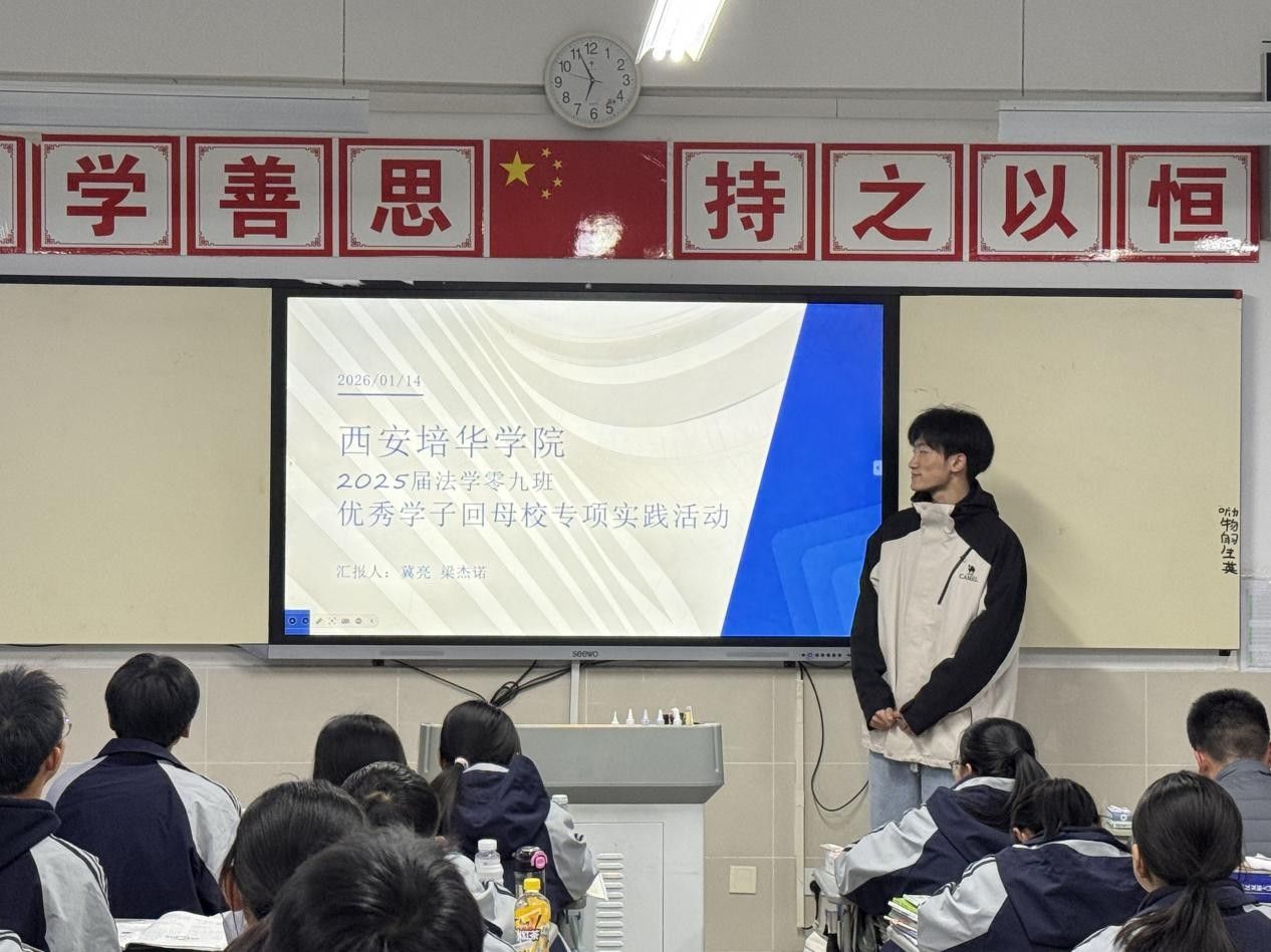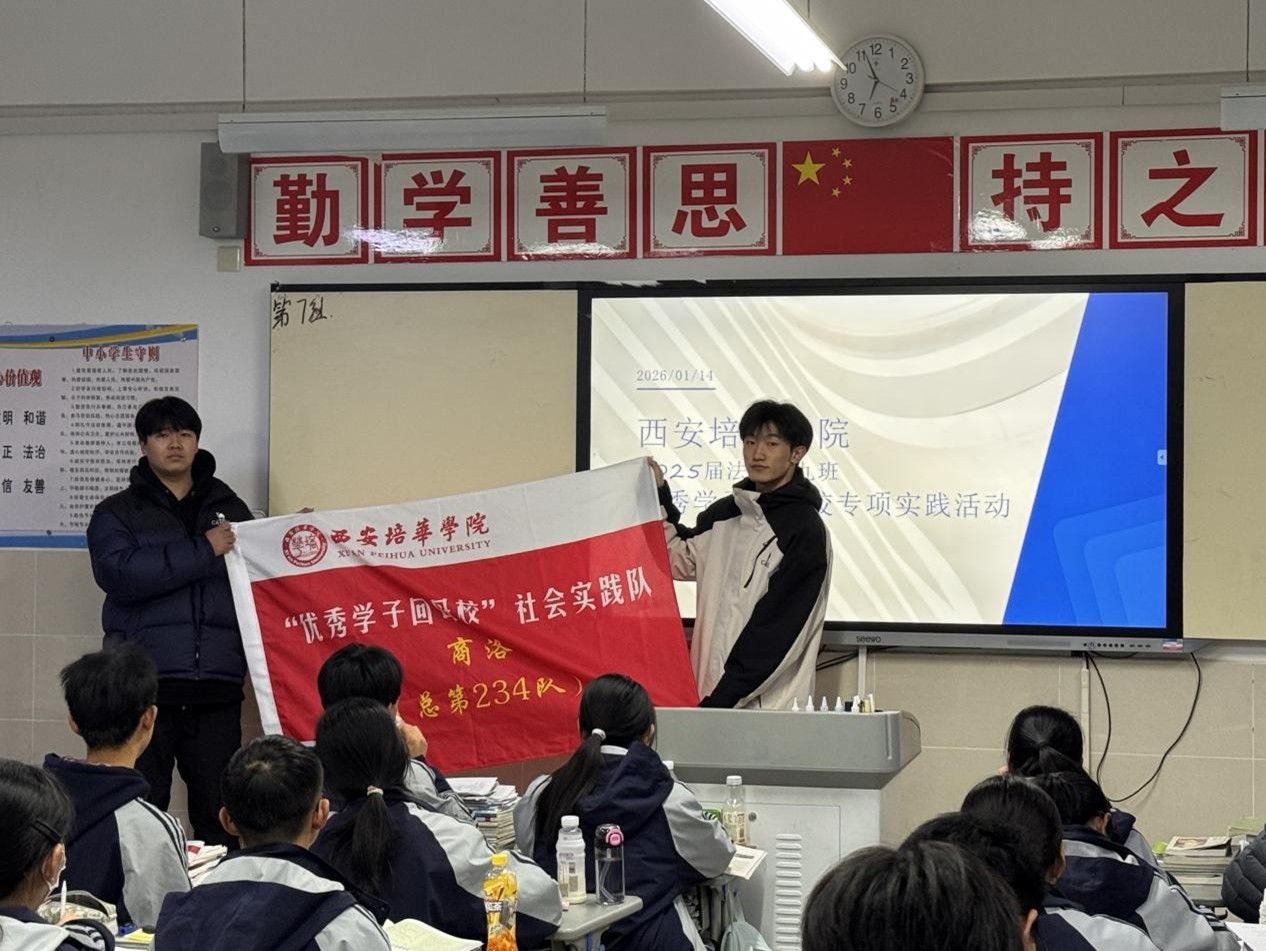为落实学校部署,强化培华学子与高中母校的纽带联系,宣传培华,发挥榜样引领作用,2026年1月14日,以梁杰诺为队长,冀亮为成员组成的法学社会实践队234队,前往商洛市高级中学和商州区高级中学开展“优秀学子回母校”专项实践活动,为高一同学们带来一场生动且富有启发意义的经验分享交流活动。