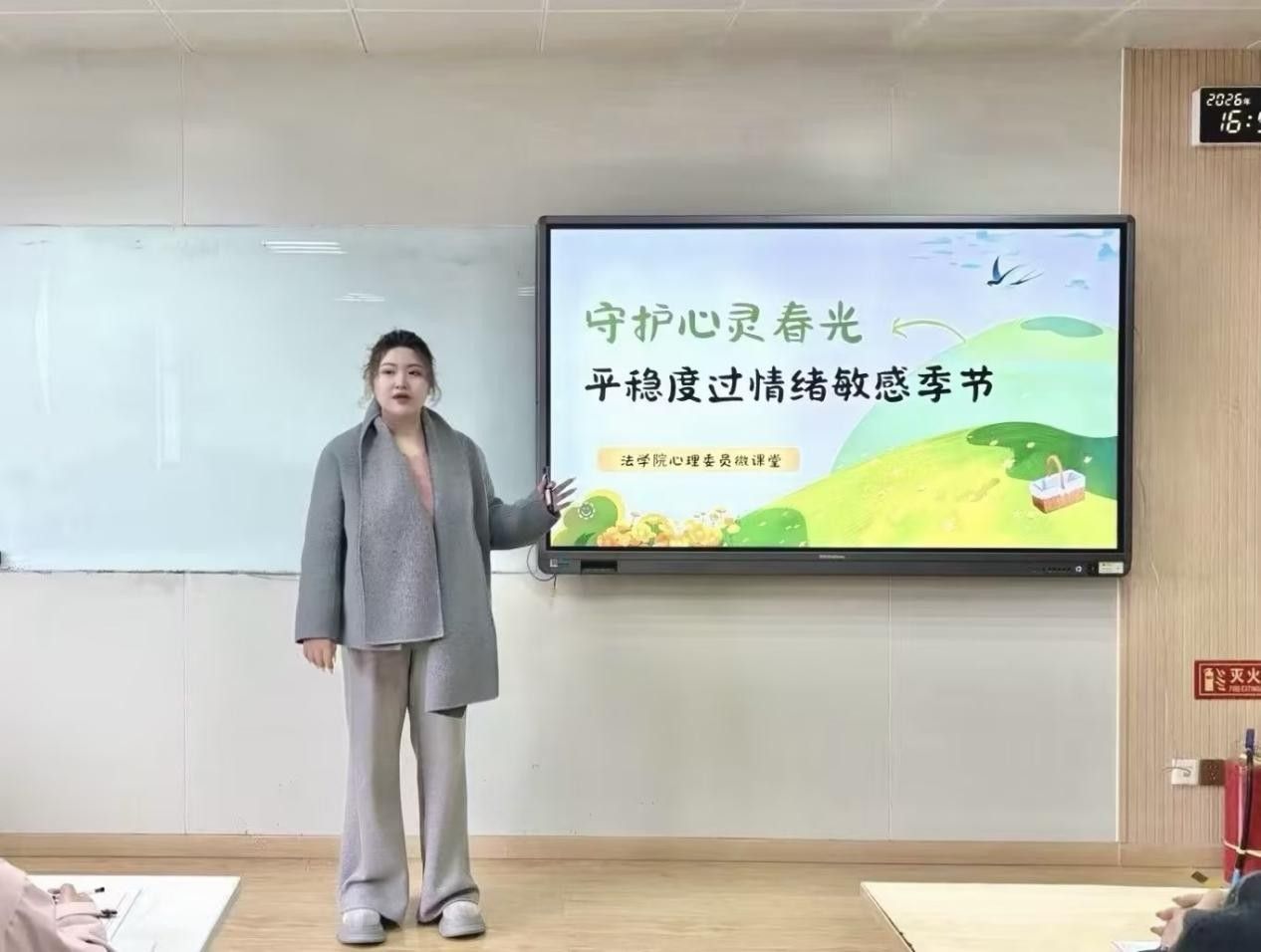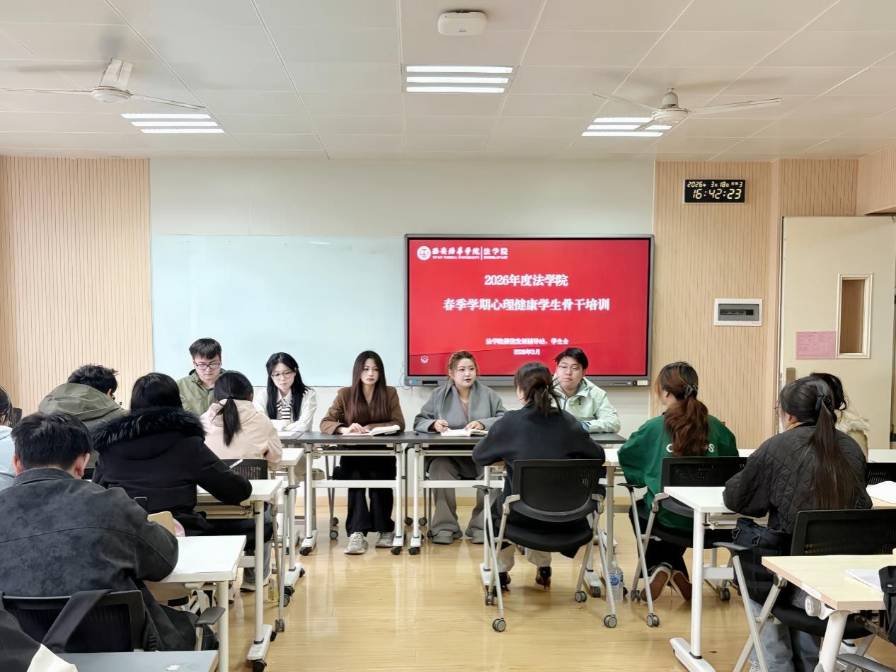 为深入贯彻教育部“健康第一”教育理念,扎实推进学生身心健康发展,提升学院心理健康工作学生骨干能力素养,筑牢校园心理健康安全防线,法学院于2026年3月18日在格物楼1201教室召开春季学期心理健康工作学生骨干培训。