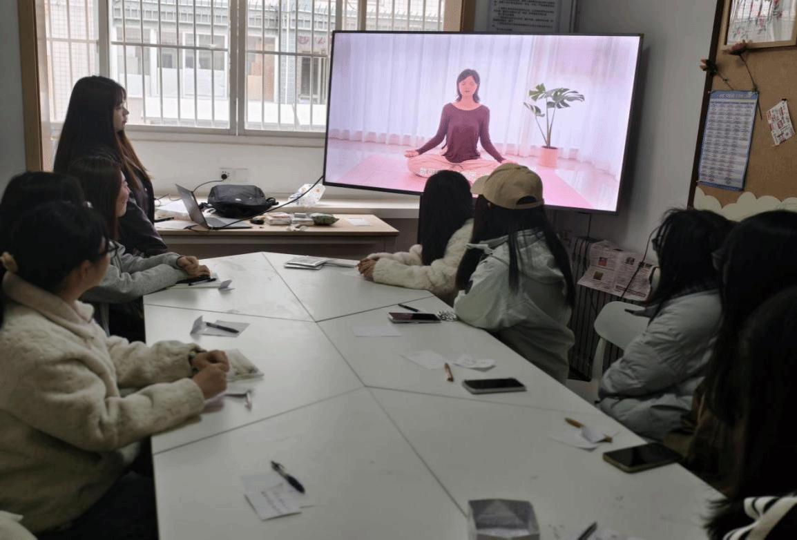 现场调暗灯光,主持人带领大家进行正念放松体验。通过深呼吸、肩颈放松等动作,同学们沉浸式感受睡前舒缓状态,直观掌握助眠方法,在静心调适中为专注学习、潜心钻研积蓄能量。