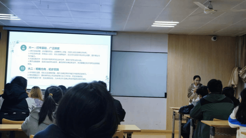安兆慧以《学业规划——“卷”对方向,法学成长分享》为题,聚焦法学学子的成长路径与发展方向展开系统讲解。她结合自身经历,提出“有效竞争”的三重维度,从目标确立、能力构建和资源利用三方面进行阐释,鼓励同学们明确成长航向,选择适合自身的发展路径,避免盲目跟风,在大学阶段持续锤炼专业本领、提升综合素养,强调“方向比努力更重要”,以深度的努力为长远发展筑牢根基。