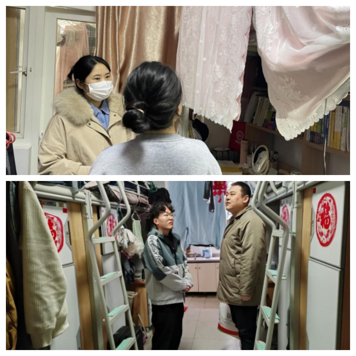 2024年2月25日部分学生返校后我院辅导员及时走访宿舍了解学生假期生活情况,返校后适应情况及需求,并对宿舍学生进行了温馨提示和新春问候。