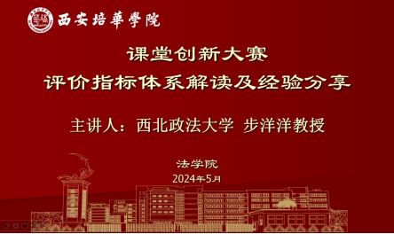 为了进一步落实立德树人的根本教育任务,提升教师的教学创新能力和教育教学水平,西安培华学院法学院于5月6日14:30在格物楼1206教室举办了一场主题为“课堂创新大赛评价指标体系解读及经验分享”的专题讲座。此次讲座邀请了西北政法大学刑事法学院的步洋洋教授主讲,旨在为法学院的全体教师提供教育教学创新的理念和方法。法学院副院长赵洁副教授与全体教师一同参加了此次讲座。
