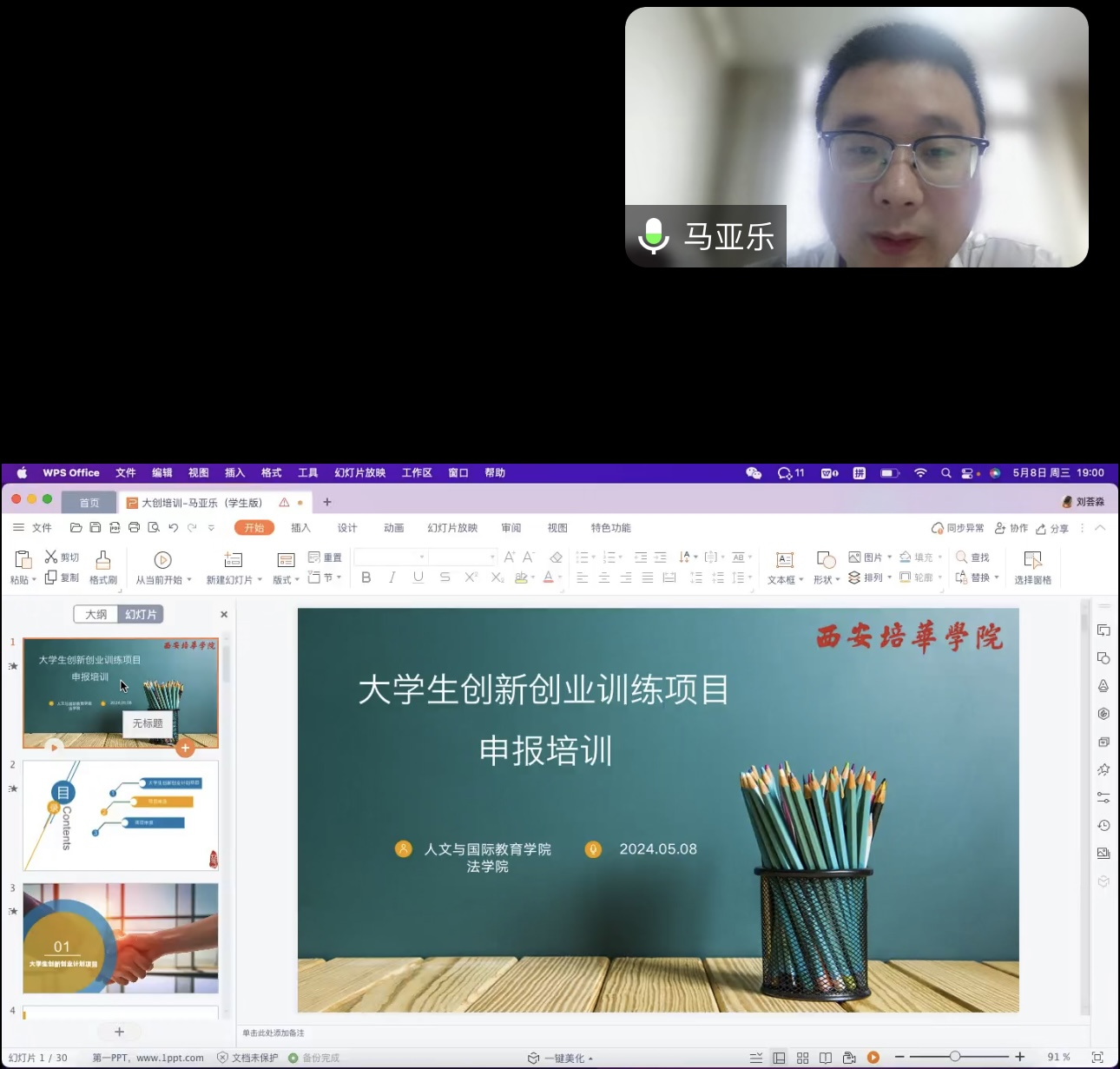 为进一步做好大学生创新创业训练项目申报培训,2024年5月8日晚19:00-20:00,法学院学院联合人文与国际教育学院共同举办了“2024年大学生创新创业训练项目申报培训”线上培训会。本次活动诚邀西安培华学院法学院法律实务教研室马亚乐主任主讲,学院选拔参赛学生70余人及部分指导教师参加了培训会。