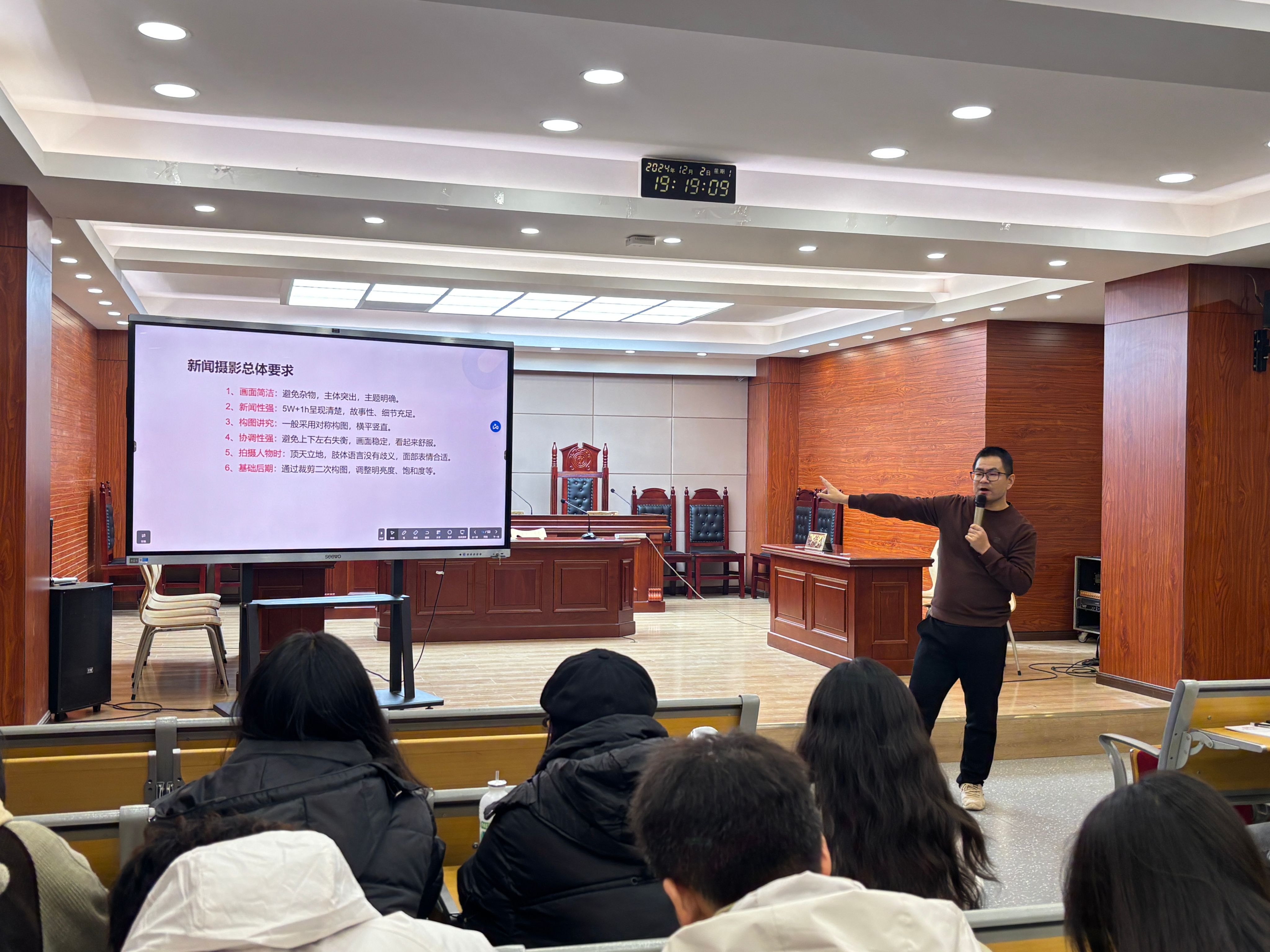 为了促进各班宣传委员的新闻稿写作与摄影技术能力的提升,我院特邀新媒体中心吕晓东老师开展法学院“青马工程”第一期学生骨干培训班暨新闻写作与摄影技能提升培训,于12月2日在1609B模拟法庭进行,法学院各班宣传委员参加培训。