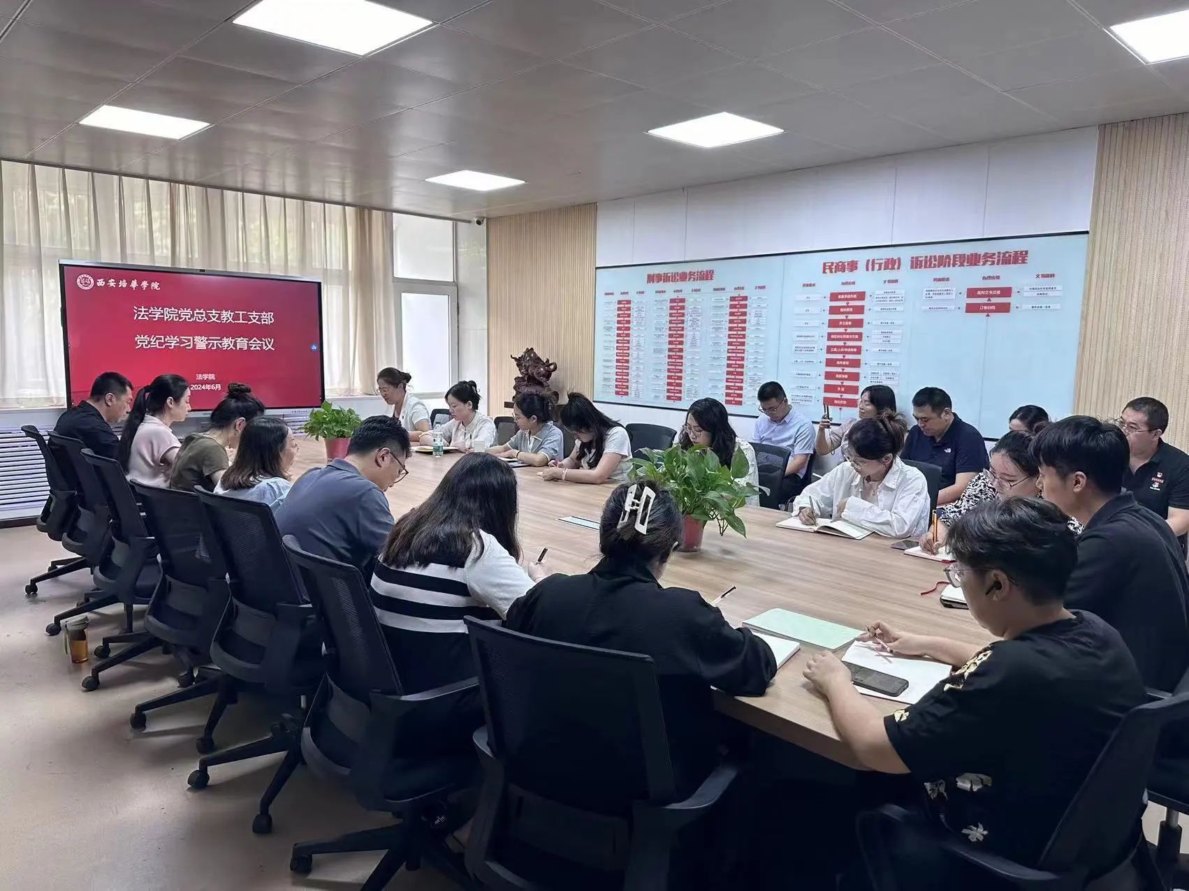 为进一步深入学习贯彻习近平总书记关于全面加强党的纪律建设的重要论述和关于党纪学习教育的重要讲话重要指示精神,扎实开展党纪学习教育,纵深推进全面从严治党,以实际成效坚定捍卫“两个确立”、坚决做到“两个维护”,法学院党总支于6月19日在1116召开了教工支部党纪学习警示教育会。学院党总支书记、党总支委员、支部书记、全体教工党员参加,会议由党务干事李紫若主持。