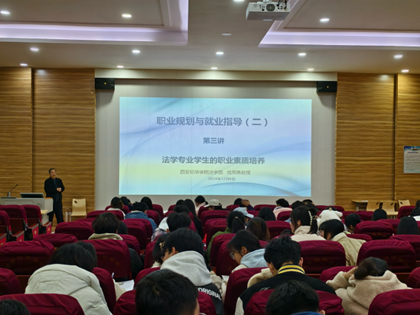 为了帮助法学学生明确职业方向,提升就业竞争力,为未来的法律职业生涯奠定坚实基础,2024年12月6日14:00,法学院组织了一场以“法学专业学生的职业素质培养”为主题的《职业规划与就业指导(二)》课程系列讲座第三讲,本次活动在格物楼报告厅举行,由理论法教研室肖周录教授主讲,2023级全体本科生参加。