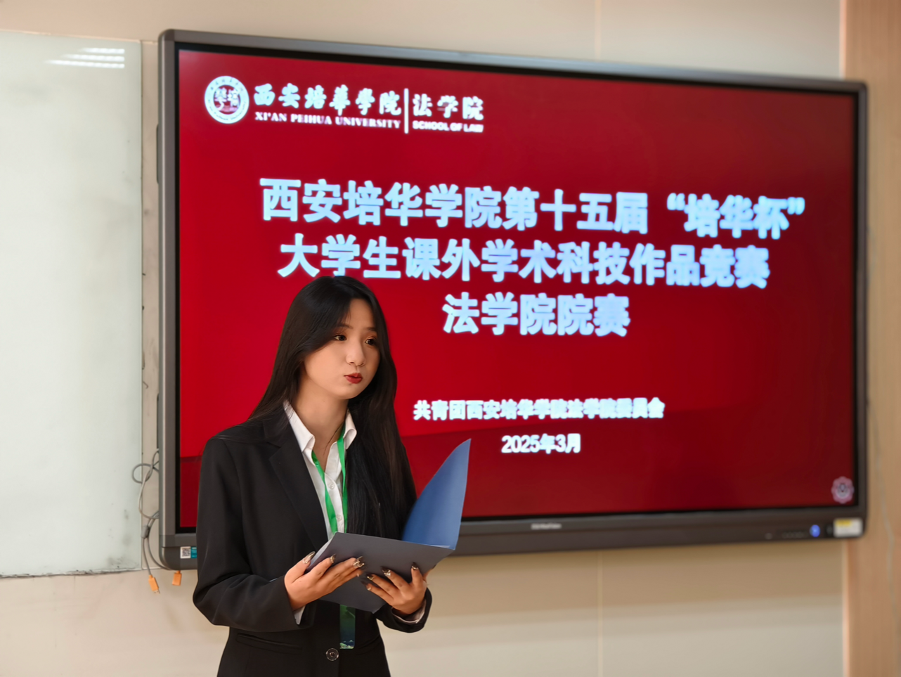 为培养学生的创新精神与实践能力,进一步提升学生的学术水平和综合素质。2025年3月20日12:20,西安培华学院第十五届“培华杯”大学生课外科技学术作品竞赛法学院院赛在格物楼1201教室顺利举行。本次法学院院赛由创新创业教研室主任江凤香、法学院团委书记董可怡以及法学院理论法教研室教师王蕾共同担任评委。经过前期班级评选,11个作品脱颖而出,顺利晋级到院赛阶段。