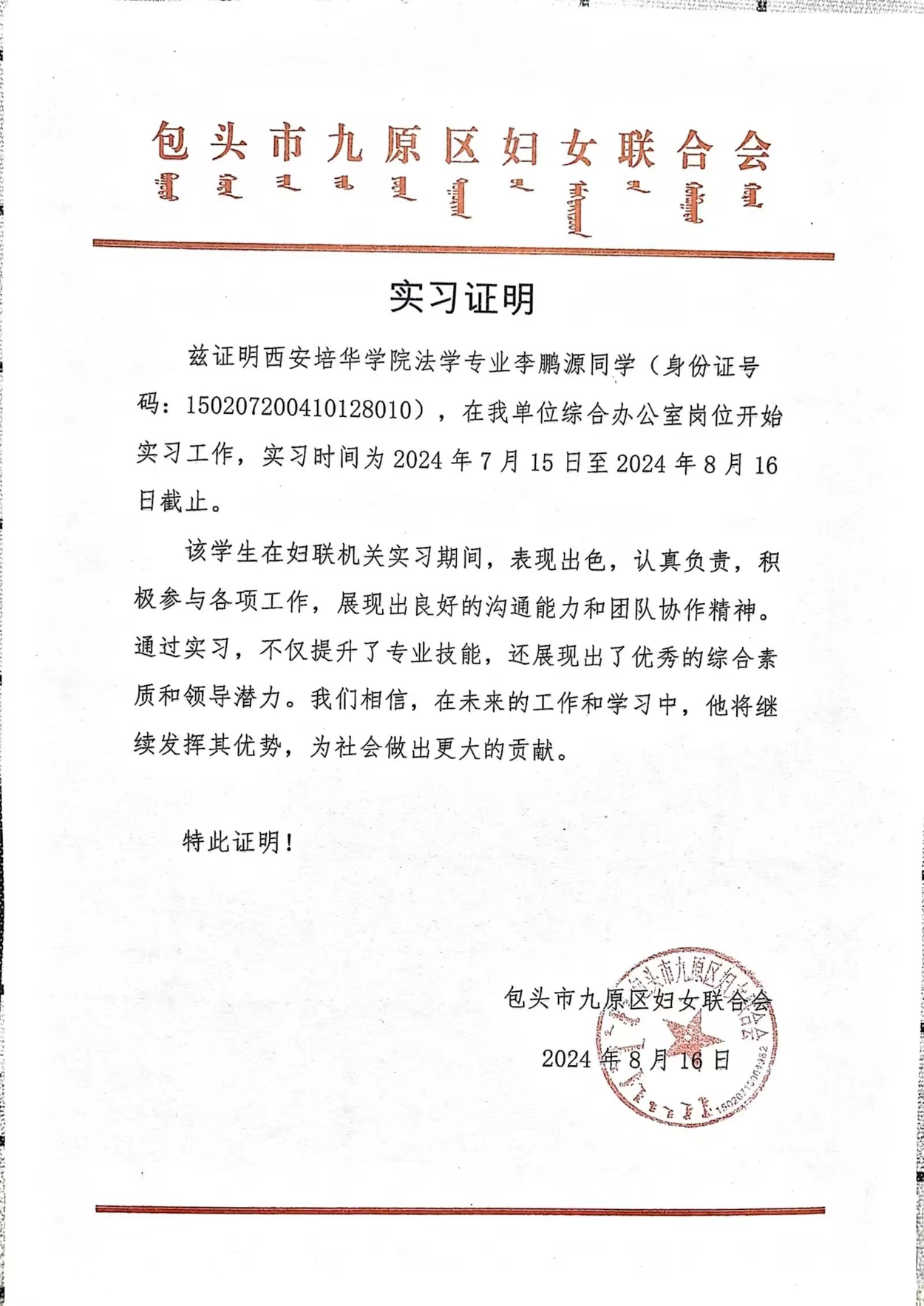 在专业学习的同时,他也践行实干,将专业知识用运到实际生活中,入学两年已有一份专业实习(上海市汉盛律师事务所--律师助理),两份社会见习(内蒙古自治区共青团包头市委员会、包头市九原区妇女联合会),在这过程中不断学习、开阔视野,来弥补自己的不足和激励自己向更加优秀的同辈学习。