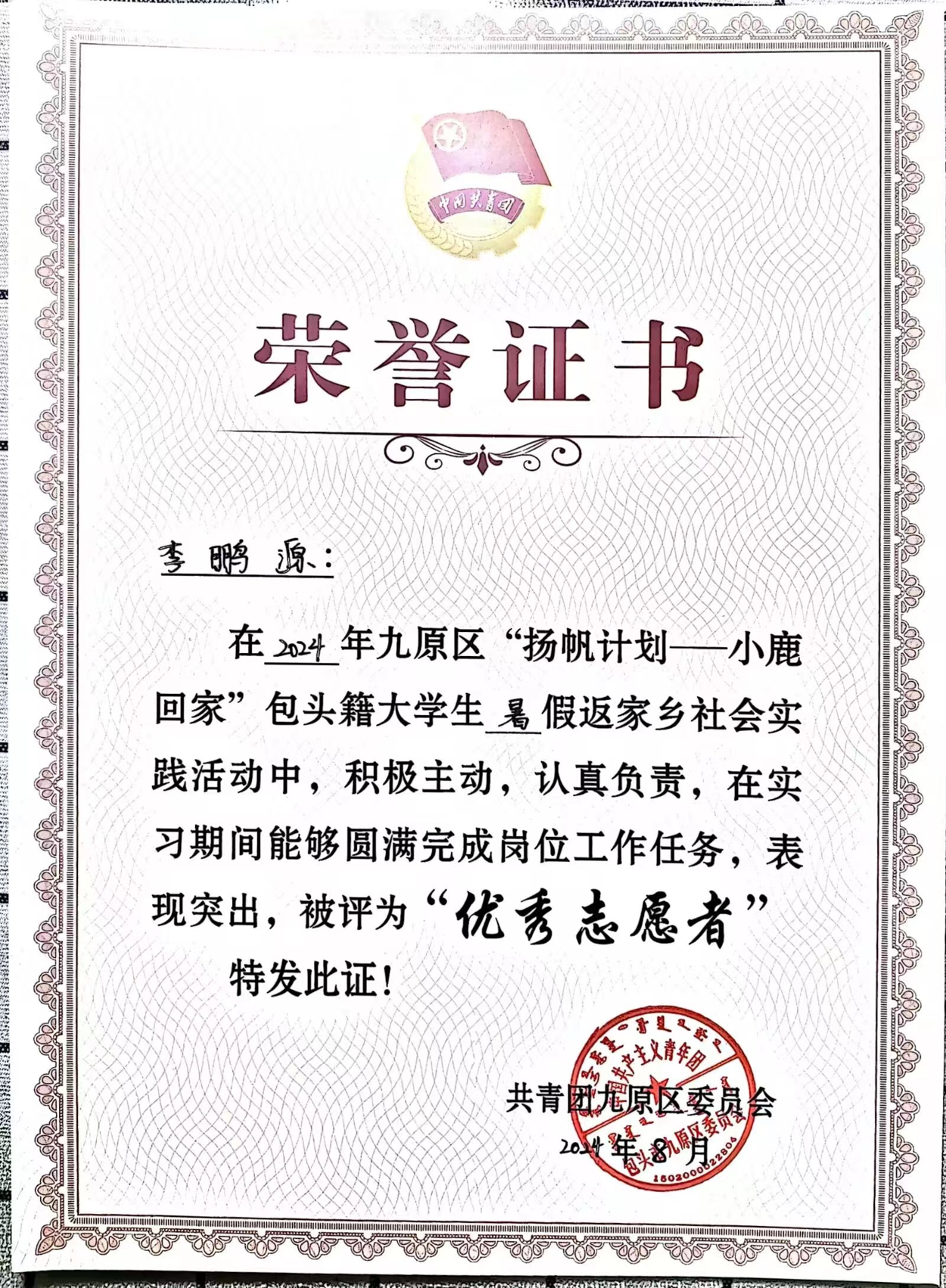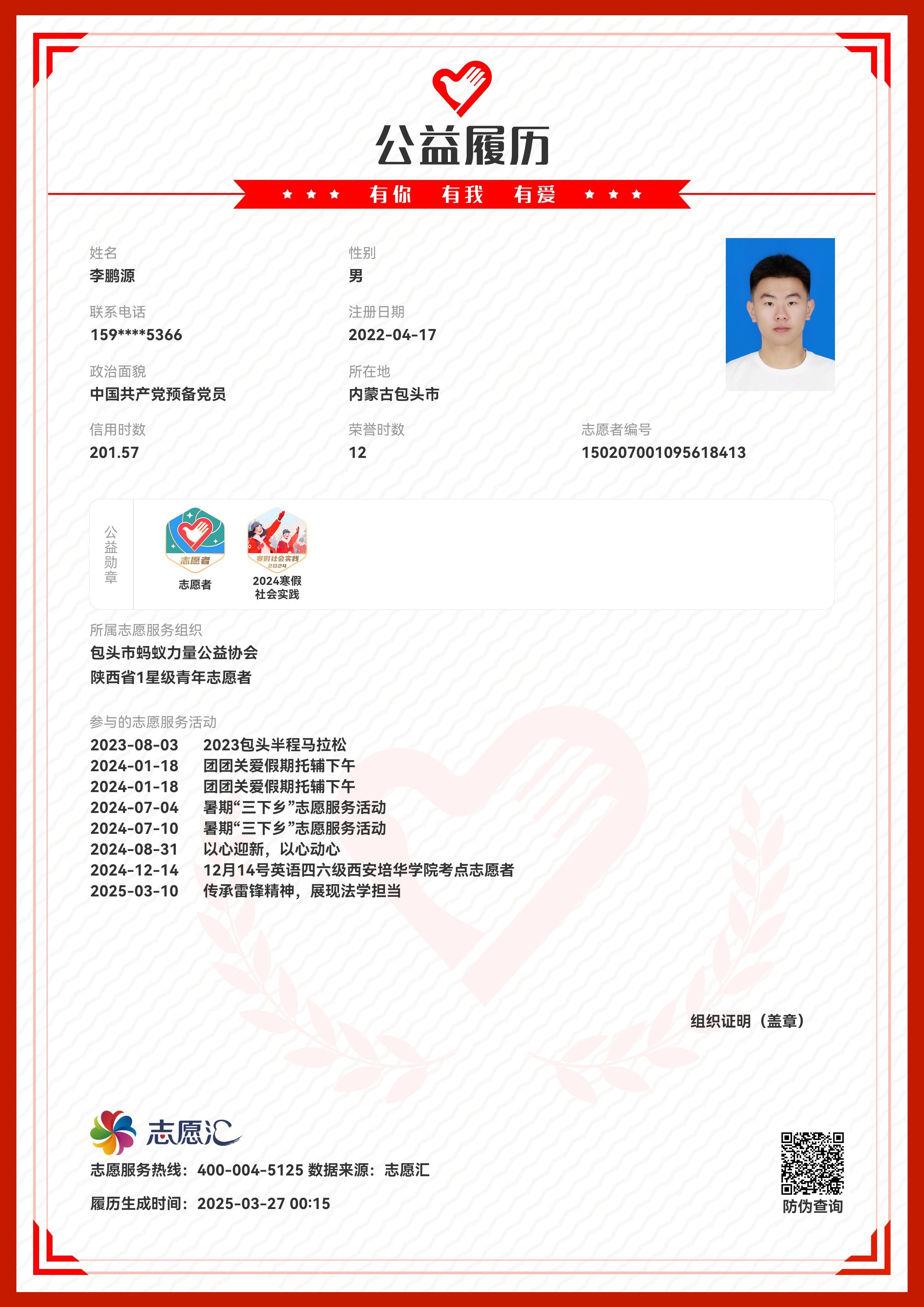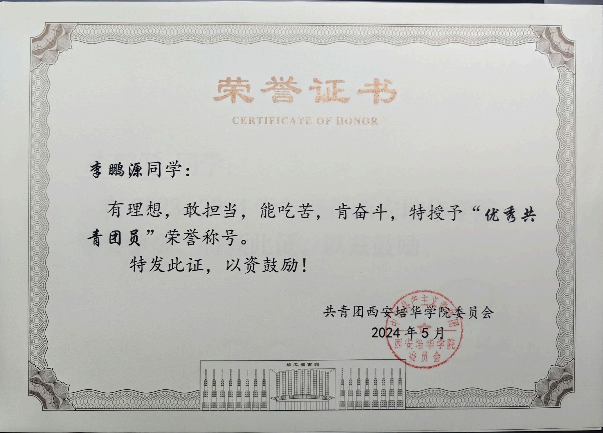 李鹏源,男,中共预备党员,培华奖学金一等奖获得者,法学2308班学生,担任法学2308班班长,西安培华学院教学信息员,考务志愿者协会成员,法学院学生第一党支部负责人,法律服务中心团支书记兼副社长。年级成绩排名前1%,平均分88.74,获得国家级、省级、校级等各项荣誉及证书十余项,并在日常学习生活中注重实践,努力提升自我。