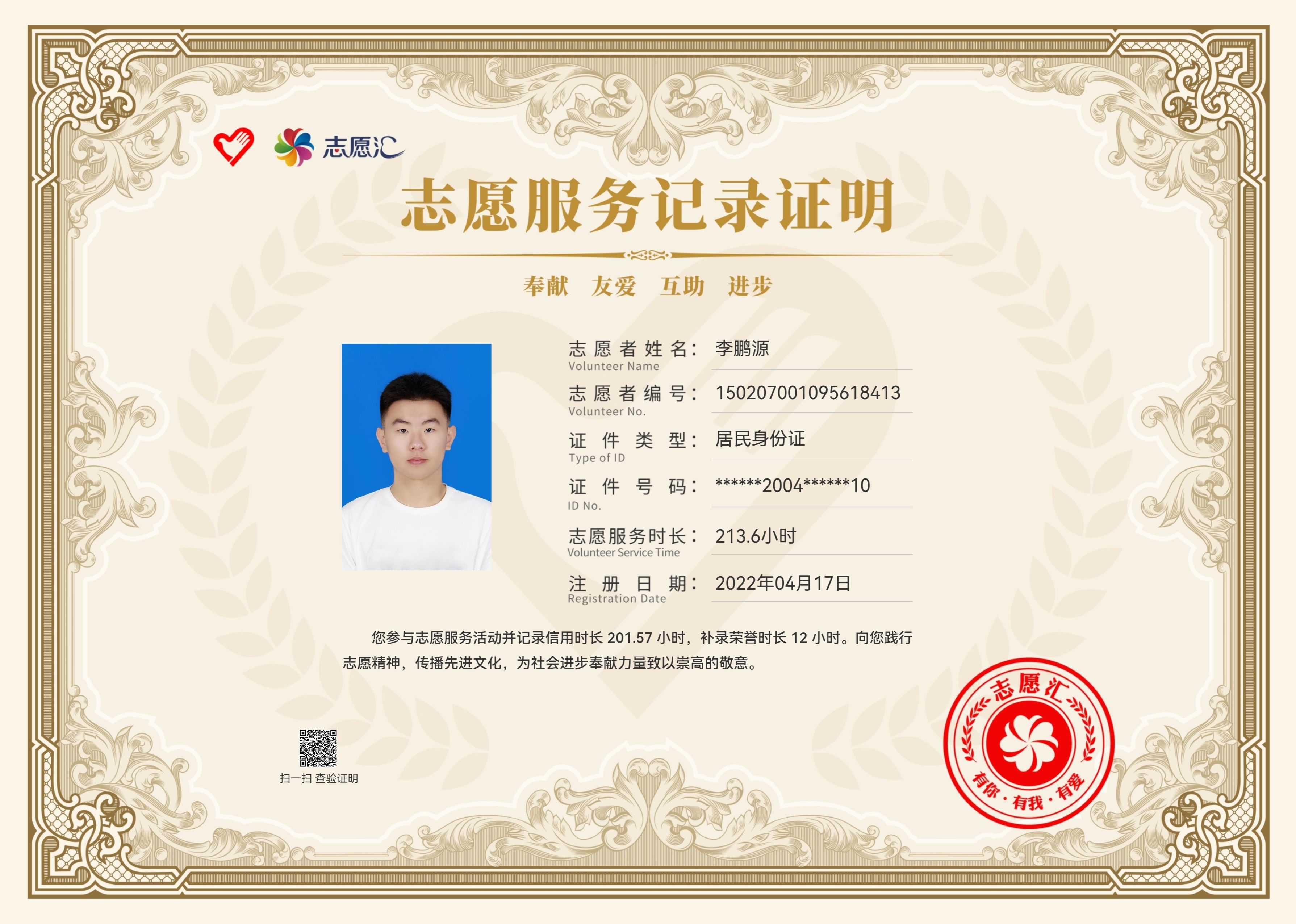 青年的担当不是口号,而是奉献青春,李鹏源同学怀揣着一颗热忱的奉献之心,在志愿的道路上也稳步前行。在日常生活中投身志愿活动20余次,累计志愿时长超200余小时,多次评为“优秀志愿者”展现属于当代大学生的青春风采。